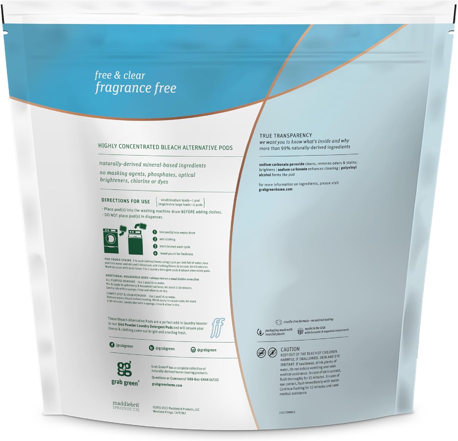 - Contains: 1- 132 Pod Bag of Grab Green Natural Fragrance Free Bleach Alternative Pods. Our velcro closure bags are convenient and easy to use, no hassling with frustrating zip closures