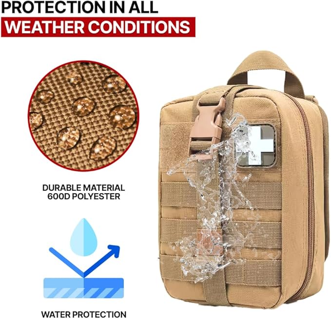 - BUILT FOR RAPID REMOVAL - Molle pouches Rip Away hook and loop panel feature and a wide handle for rapid removal makes first aid molle pouch a sp to render first aid quickly. Our heavy duty military grade IFAK Molle Medical Pouch is made from 600D polyester material. The is reinforced and double stitched at all stress points. The closures are secured by high quality YKK zippers with nylon pulls that are rust resistant and tough.
