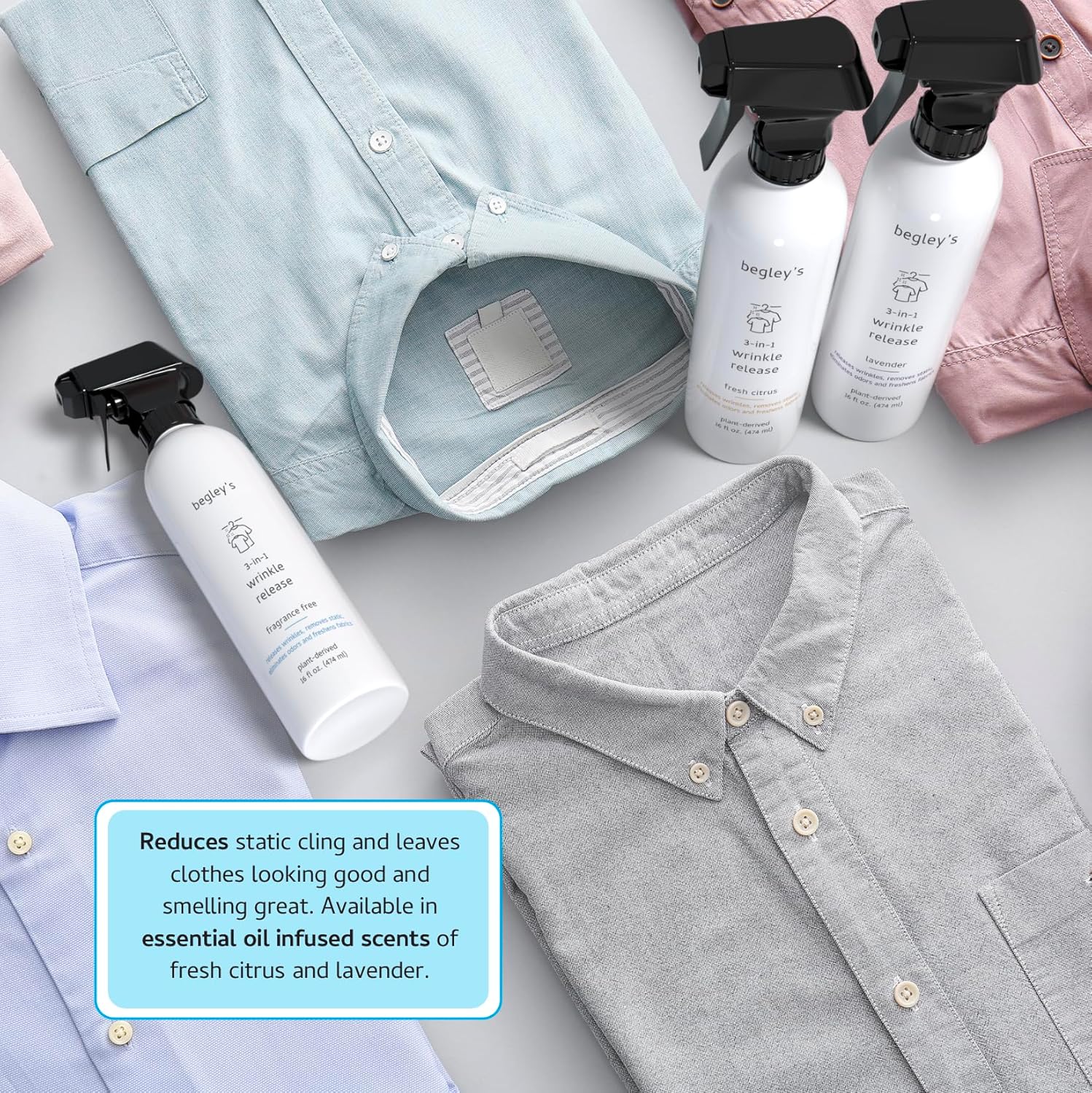 Begley's 3-in-1 Wrinkle Remover, Quick Fix Wrinkle Release, Static Cling Remover, Odor Eliminator and Fabric Refresher Spray - USDA Certified Biobased - Citrus, 16 oz
