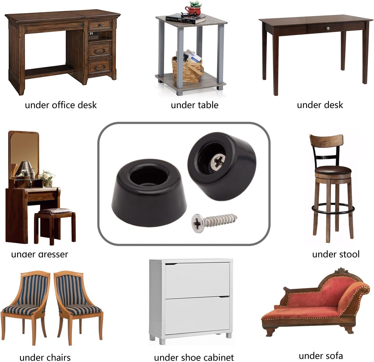- Can be used under the leg or feet of dresser,table,cabinet,dining room chair,sofa,couch,footrest,barstool,shower bench,desk leg tips,cutting board,walking sticks.