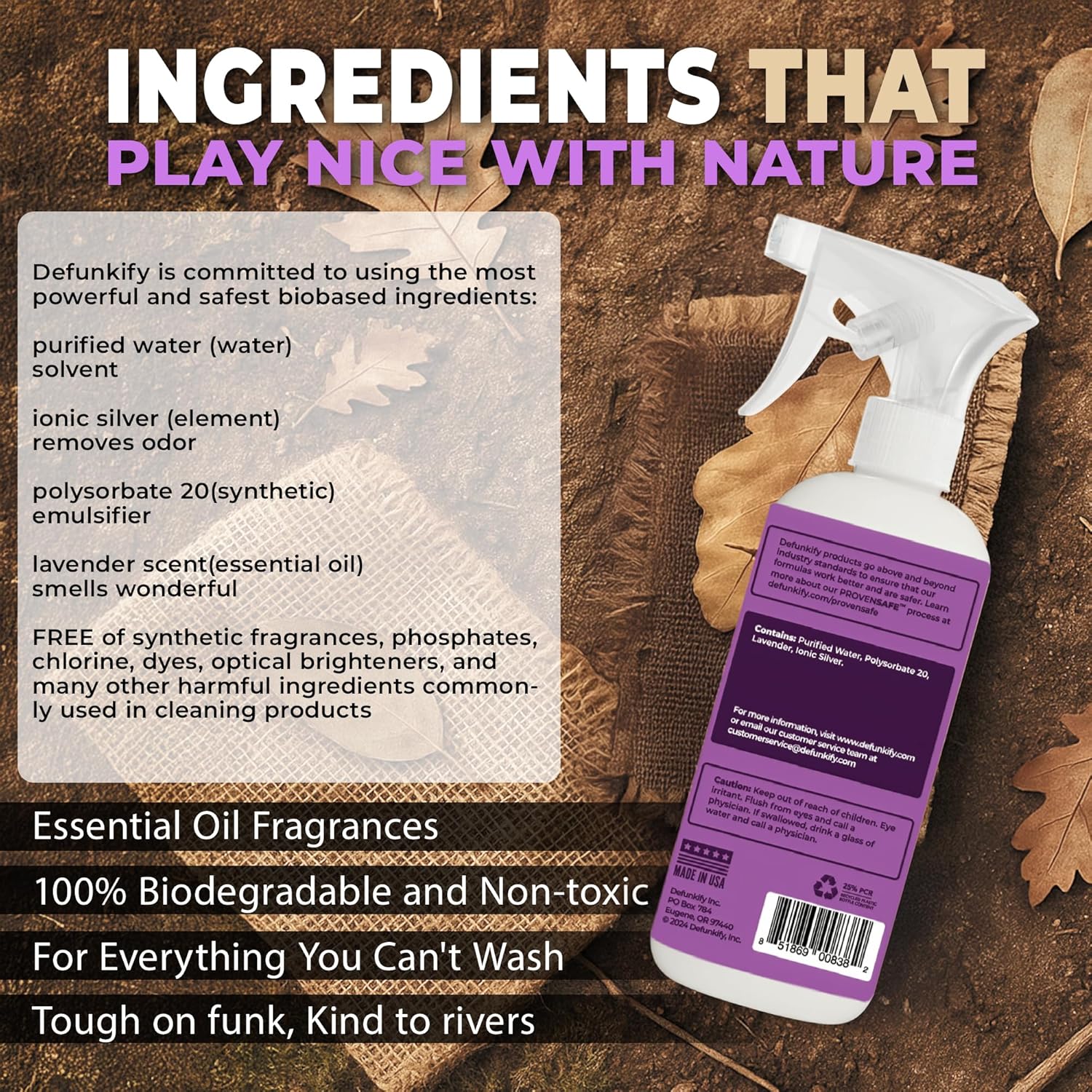 - 𝗘𝗳𝗳𝗼𝗿𝘁𝗹𝗲𝘀𝘀𝗹𝘆 𝗣𝘂𝗿𝗲 𝗗𝗲𝗼𝗱𝗼𝗿𝗶𝘇𝗲𝗿: Using only powerful biobased non-toxic ingredients like ionic silver, Defunkify's pure 'Lavender' 100% essential oil lightly scented odor remover is free of synthetic fragrances, ammonia, phosphates, chlorine, formaldehyde, & more. Defunkify's 'ProvenSafe' deodorizing formula is 𝗶𝗱𝗲𝗮𝗹 𝗳𝗼𝗿 𝘁𝗵𝗼𝘀𝗲 𝘄/ 𝘀𝗲𝗻𝘀𝗶𝘁𝗶𝘃𝗲 𝘀𝗸𝗶𝗻, 𝗸𝗶𝗱𝘀, 𝗽𝗲𝘁𝘀 & 𝗲𝘅𝗽𝗲𝗻𝘀𝗶𝘃𝗲 𝗴𝗲𝗮𝗿. Safe for activewear & everything you don't wash