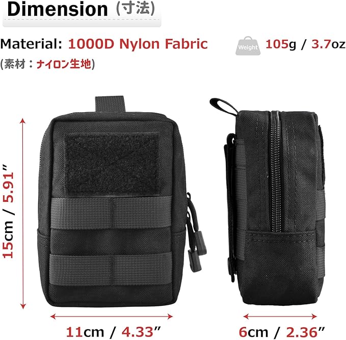 - π€ MATERIAL: One item includes 2 tactical bags. Large tactical bag: 6.49" x 4.53" x 1.57", made of 1000D high-density polyester material; Small tactical pouch: 5.91" x 4.33" x 2.36", made of 1000D high-density nylon material. Both have better tear resistance and water resistance