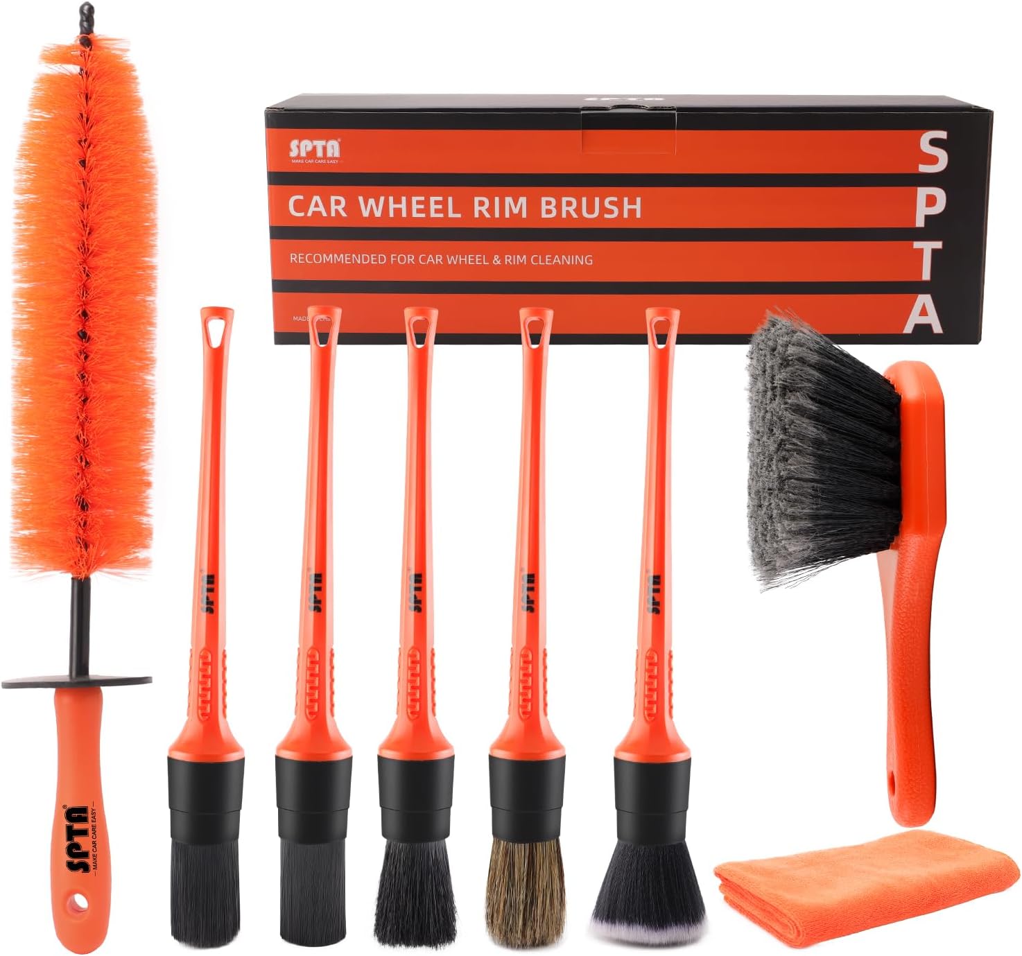 - šćWIDELY USAGEćThis kit includes 7 kinds of brushes, can clean both interior and outside of the car. They can be used on cars, trucks, motorcycles, bicycles, RVs, boats, wheels, tires, rims, spokes, grills, engine bays, exhaust tips, bumpers, vents, inner fender, wheel brake, undercarriage and much more.