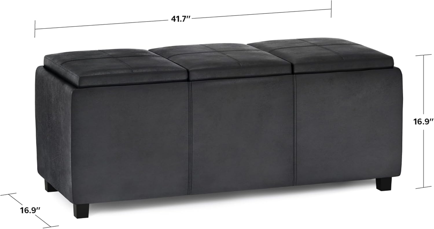 SIMPLIHOME Avalon 42 inch Wide Contemporary Rectangle Storage Ottoman in Distressed Black Vegan Faux Leather, Assembled, For the Living Room, Entryway and Family Room