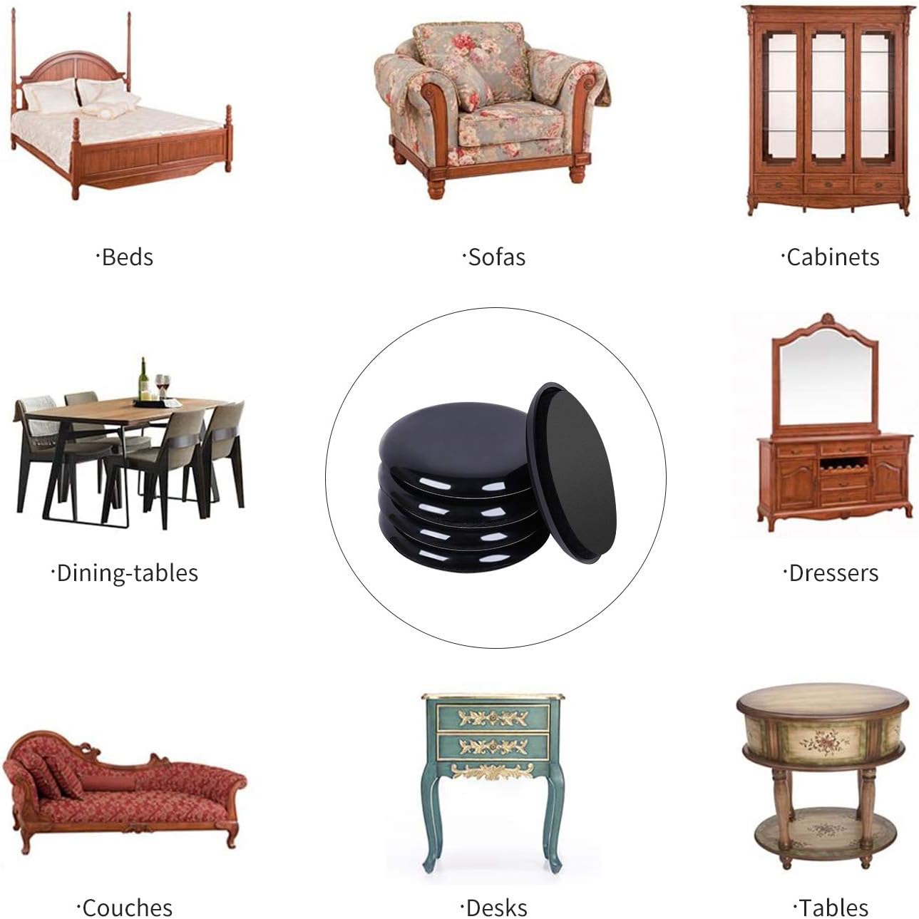 - ☛【Easy to Use】- Slightly lift or tilt the object to be moved and place a round carpet furniture sliders underneath each leg bottom or corner. Black non-stick EVA gripper pad must face upwards, then simply push or pull the object that needs to be moved.