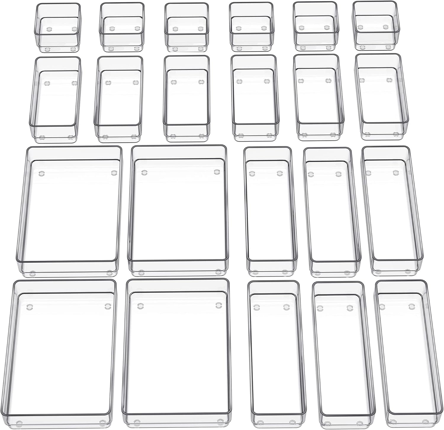 SMARTAKE 22-Piece Drawer Organizer with Non-Slip Silicone Pads, 4-Size Clear Desk Drawer Organizer Trays Storage Tray for Makeup, Jewelries, Utensils in Bedroom Dresser, Office and Kitchen, Clear