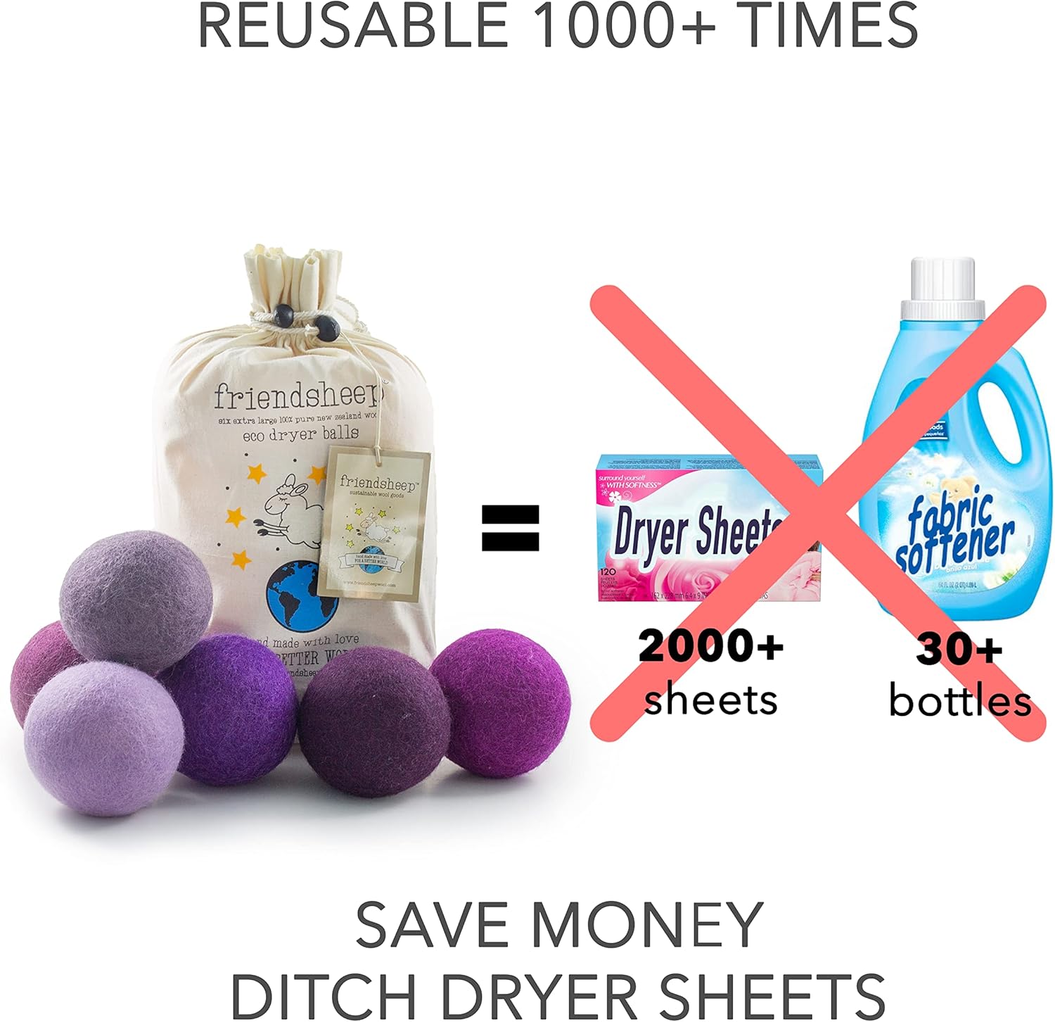 Friendsheep Wool Dryer Balls Purple 6 Pack XL Organic Premium Reusable Cruelty Free Handmade Fair Trade No Lint Fabric Softener Color - Purple Haze