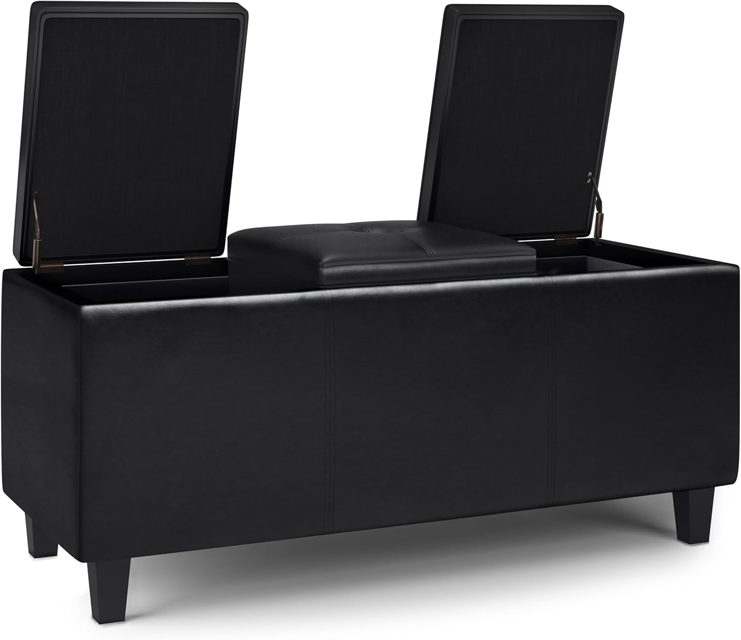 SIMPLIHOME Avalon 42 inch Wide Contemporary Rectangle Tray Storage Ottoman with Lift Up Lids in Midnight Black Vegan Faux Leather, Assembled, for the Living Room, Entryway and Family Room