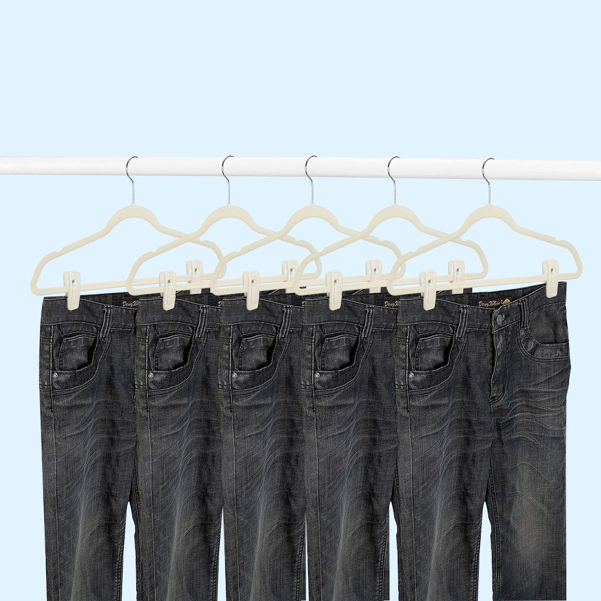 - β High-quality material: These hanger clips are made of PP material and covered with high-grade soft beige velvet. It is very sturdy and durable. The beige velvet hanger clips of 60packs can be easily matched with velvet hangers of any color and size. It looks very elegant and beautiful.