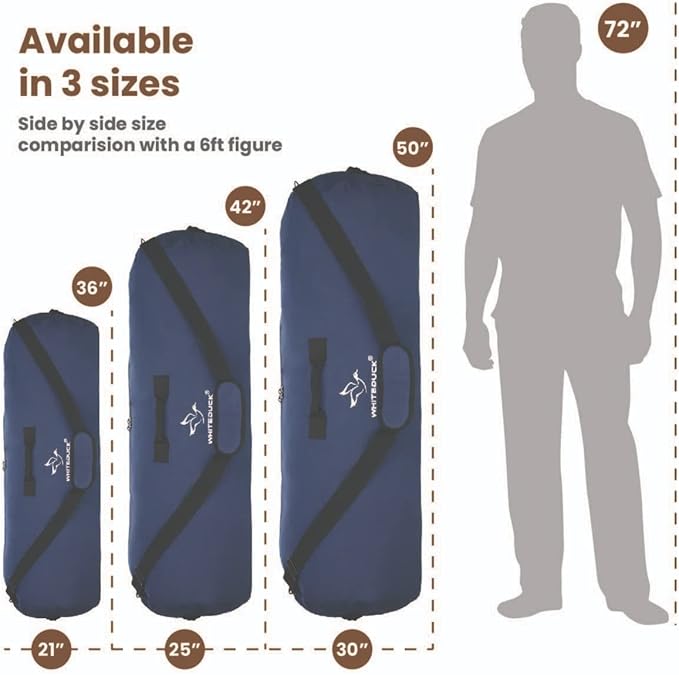 • SPACIOUS MAIN COMPARTMENT: Durable and functional duffle bag comes in 3 different sizes; Standard Size: 36" (Height) x 13" (Diameter) | 21" Flat Width, Large Size: 42" (Height) x 15" (Diameter) | 25" Flat Width, Extra Large Size: 50" (Height) x 18.5" (Diameter) | 30" Flat Width, depending upon your need. Itโ€™s large enough to store all your gear and gym accessories for long trips and traveling. This tight woven canvas won't rip or tear apart. Perfect for packing, moving and storing items.