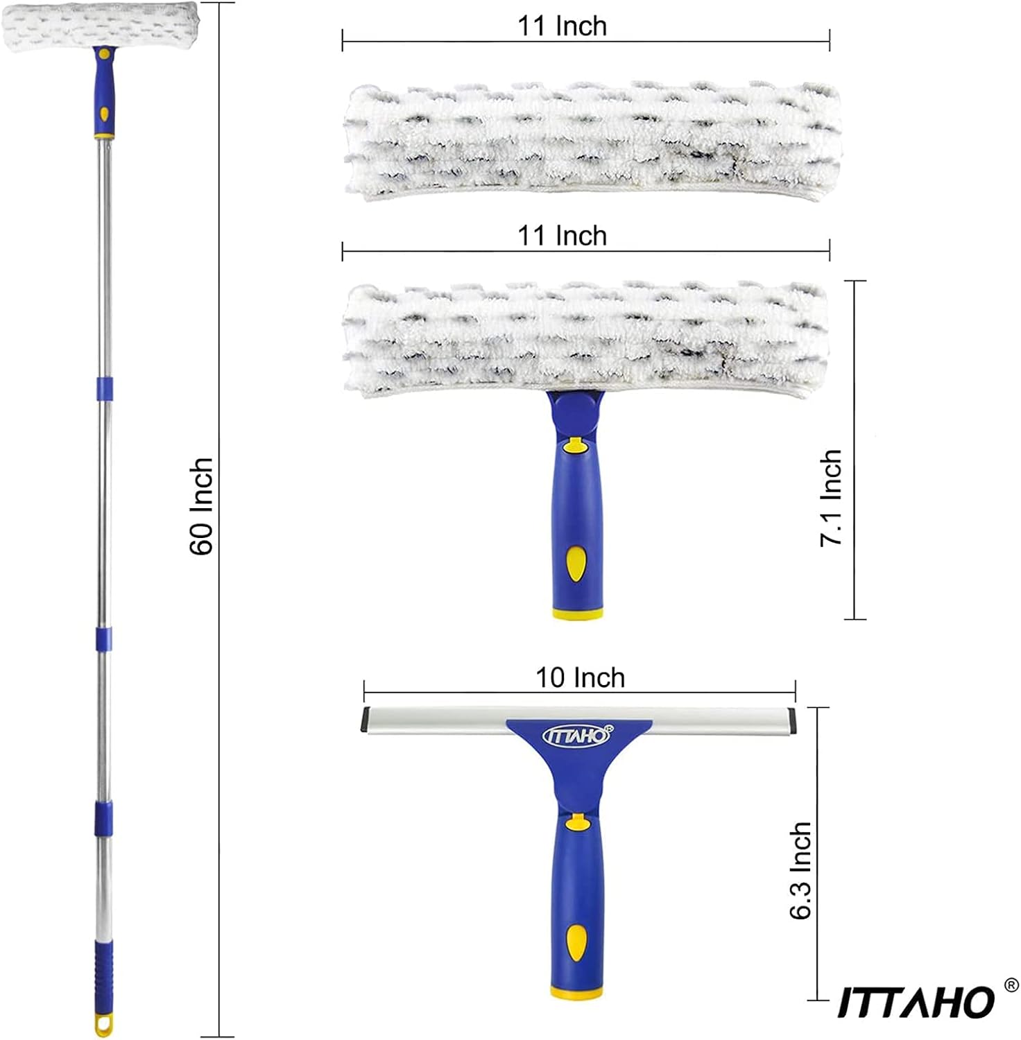 - Window Washing Squeegee Package: 1 x 10 inch squeegee, 2 x 11 inch microfiber scrubber, 3 section of extension pole.ITTAHO color box packaging.The best gift for father,mother,women and men