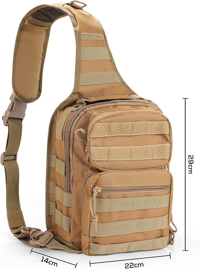 - 【Package Included】One tactical sling pack, one molle Pouch and one water bottle pouch holder, can be attached to tactical vest, camping/ hiking backpack or other equipment with MOLLE system