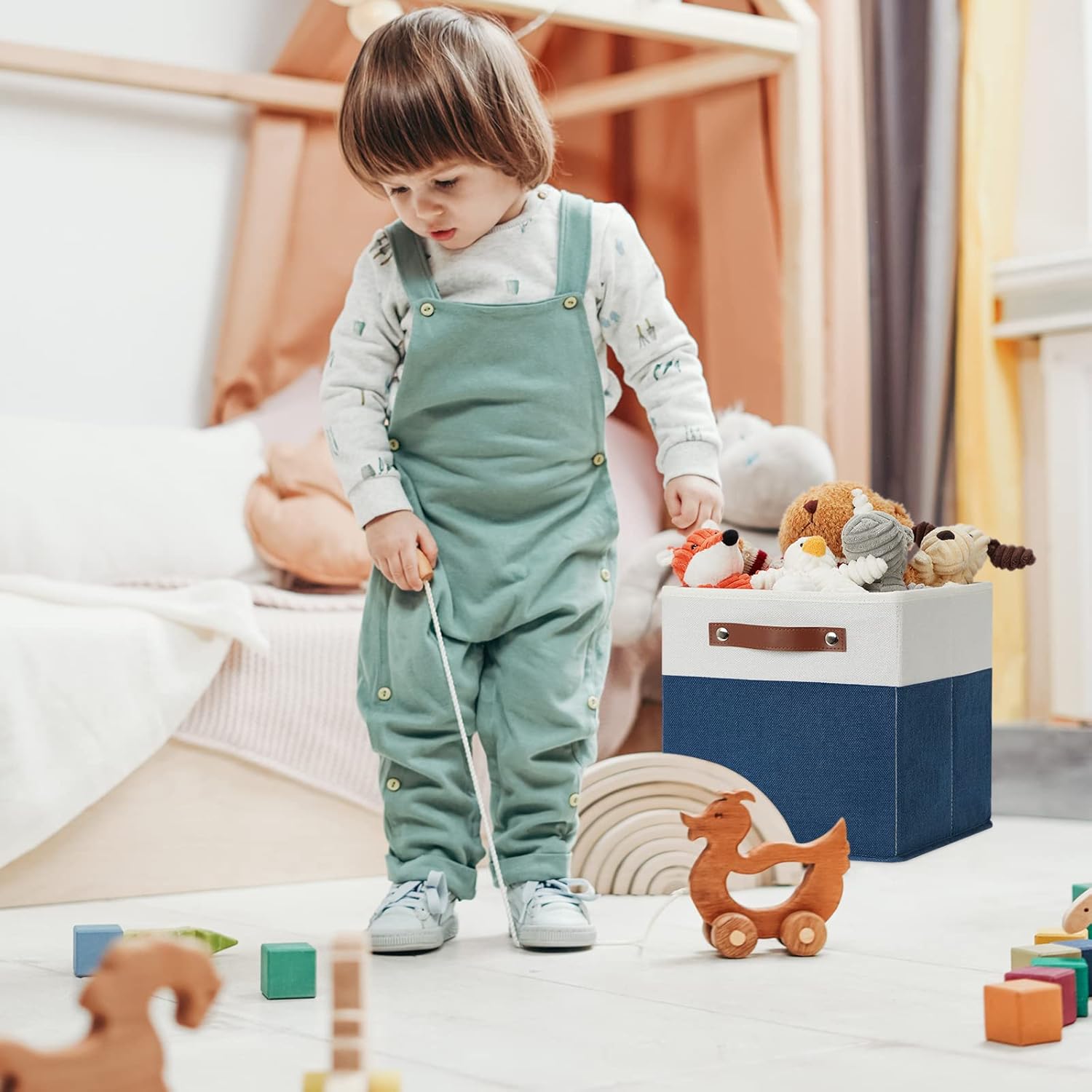 DULLEMELO Fabric Bins for Cube 11x11, Gift Baskets Empty for Boy Girl Mother Father Christmas Festival,Fabric Storage Bins Cube Organizer Baskets With Leather Handles(White&Blue)