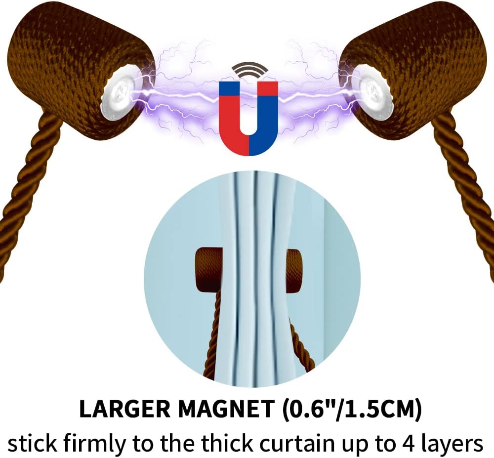 - NO DRILLING & INSTALLATION:The magnetic rope tie backs with modern upgraded stronge/durable magnets,hand-tiwsted woven texture apperance rope, heavy-duty polyester rope. No need any tools,no drilling your wall, so magnetic curtain tiebacks for drapes will not damage the wall easy to operate,hold your curtain in seconds. It is a perfect substitute for wall-mounted hooks and could be tied on anywhere, and you don’t need to worry about the extra curtain hooks hurting the child