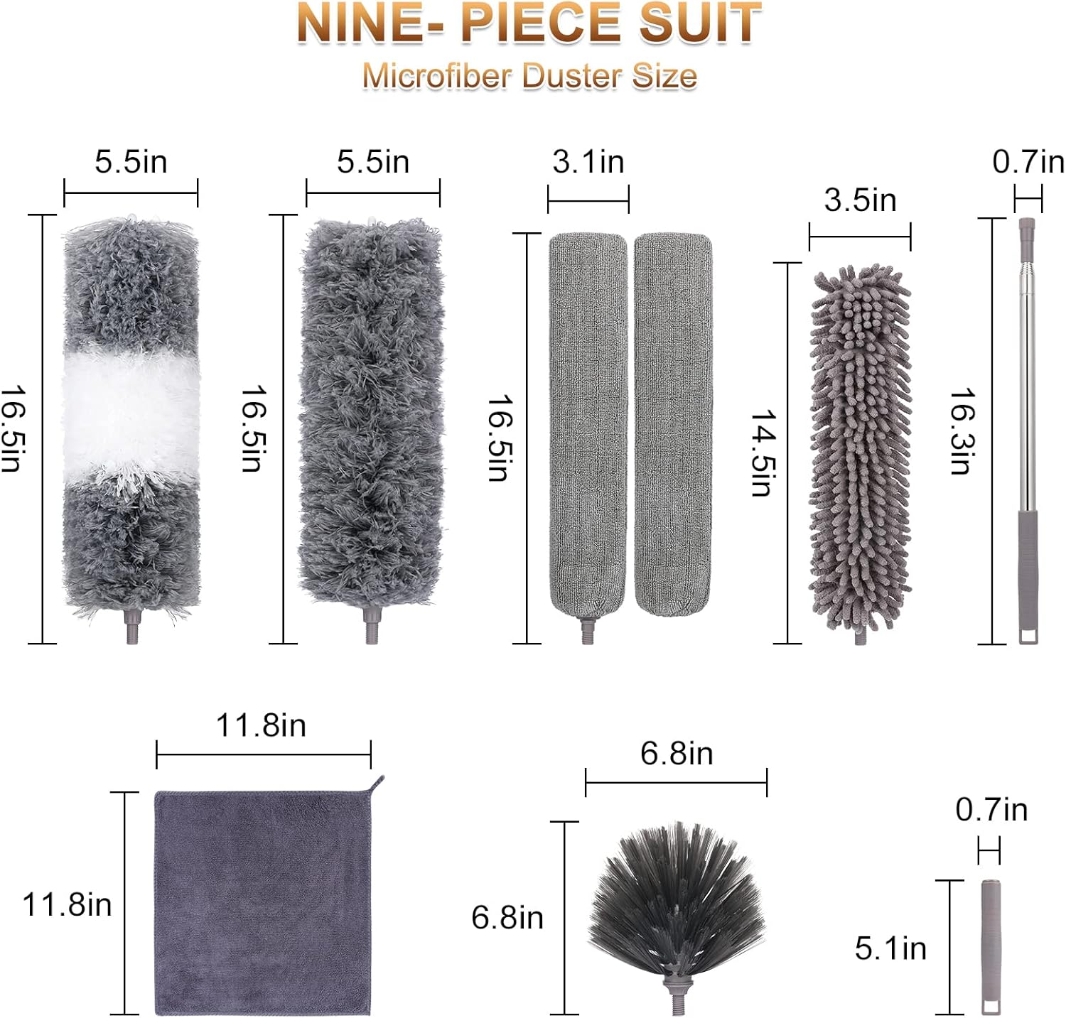 - 【Upgraded 9 Pcs Dusters Kit】: This multifunction dusters for cleaning kit includes a extendable long pole and a mini pole, 2 bendable microfiber duster head,1 chenille duster head, 1crevice brush, 2 flat brush dust cloth, 1cobweb duster head. Replacing different types of duster brush heads which can easily allows you to clean hard-reach any places, contains everything you will need to clean your home from floor to ceiling, keeping your home away from dust.
