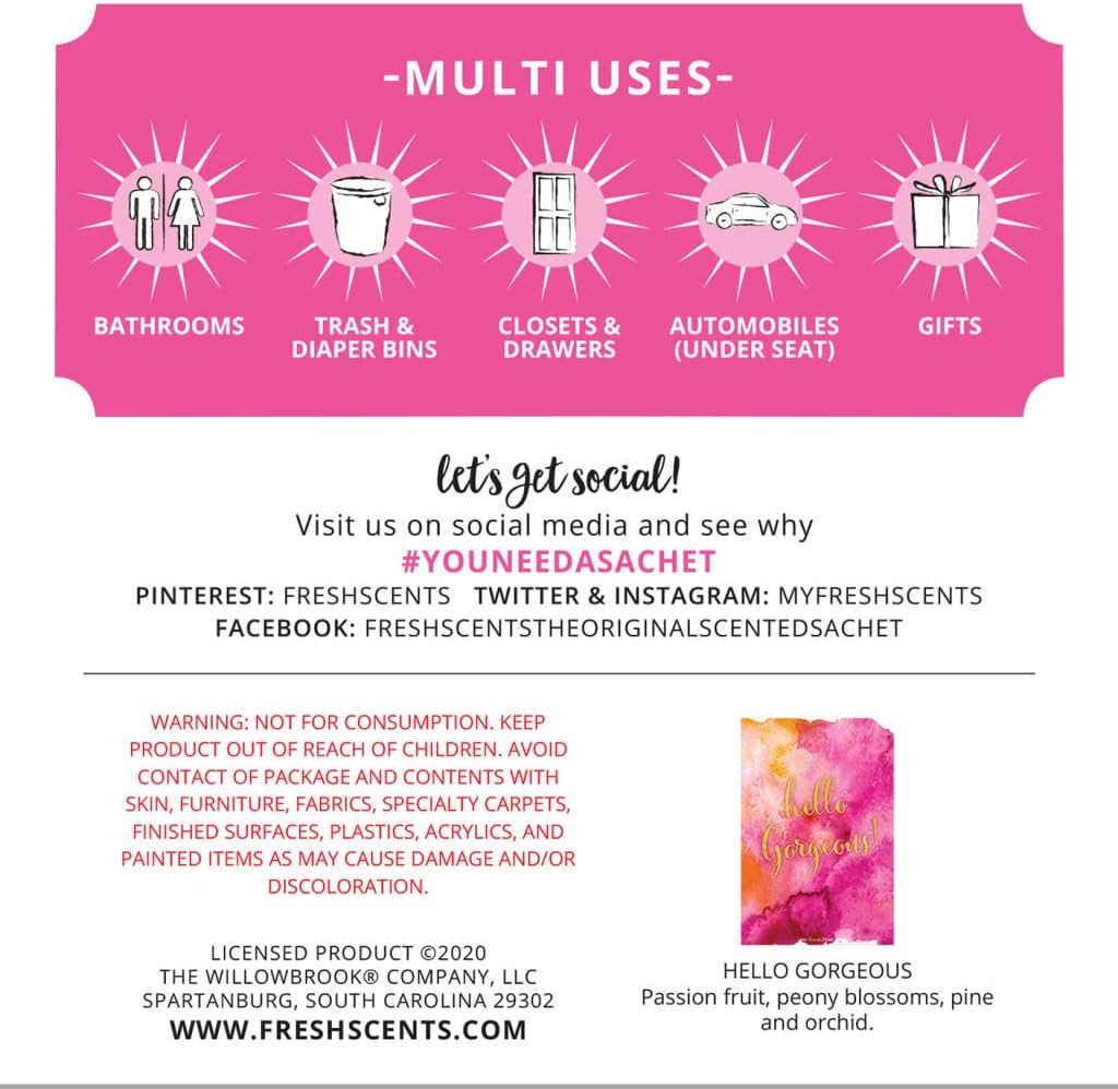 WillowBrook | Fresh Scents Scented Sachet Packet | Hello Gorgeous | Air Freshener Bags for Drawers, Closets, Cars | 6 Pack | Long Lasting Home Fragrance