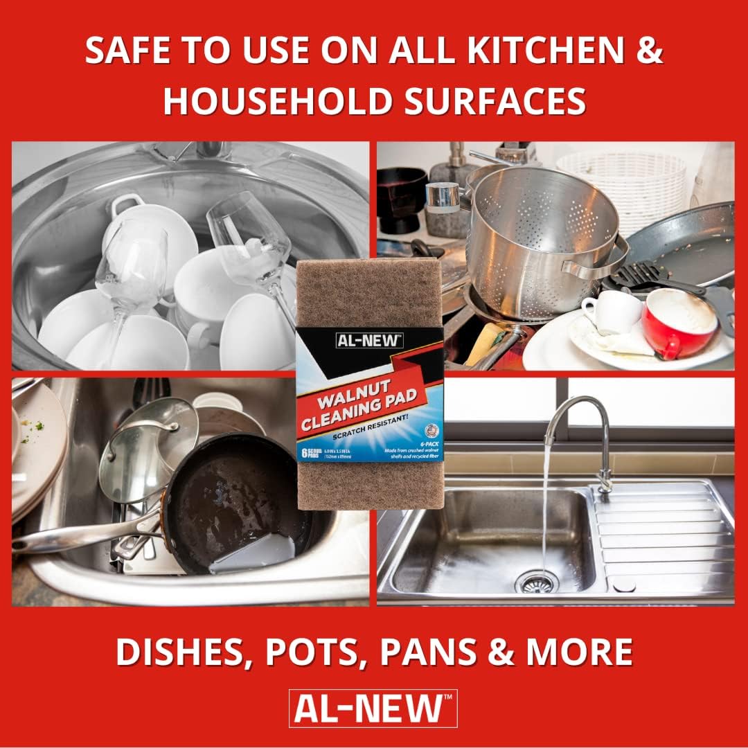 AL-NEW Walnut Cleaning Pads | Versatile, Scratch Resistant Household Cleaning & Scouring Pads for Kitchen Cleaning, Dishes, Pots, Pans & More (6 Pack)