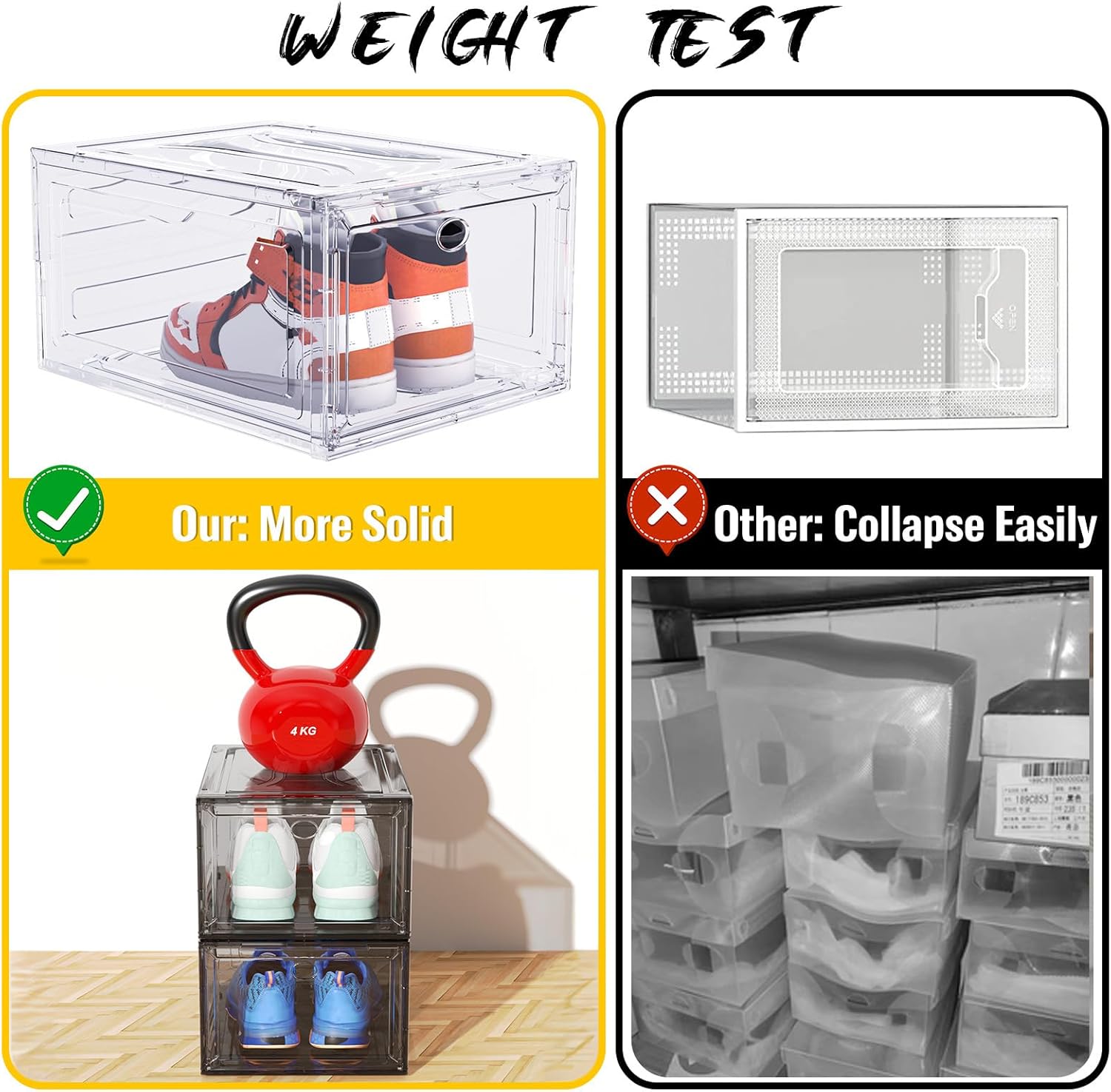 - Multipurpose storage: These clear shoe boxes stackable is designed for making it easier to find anything in need. Good for organizing with shoes, clothes, socks, hat, scarves and accessories. Finally, stack the boxes neatly to save a lot of space