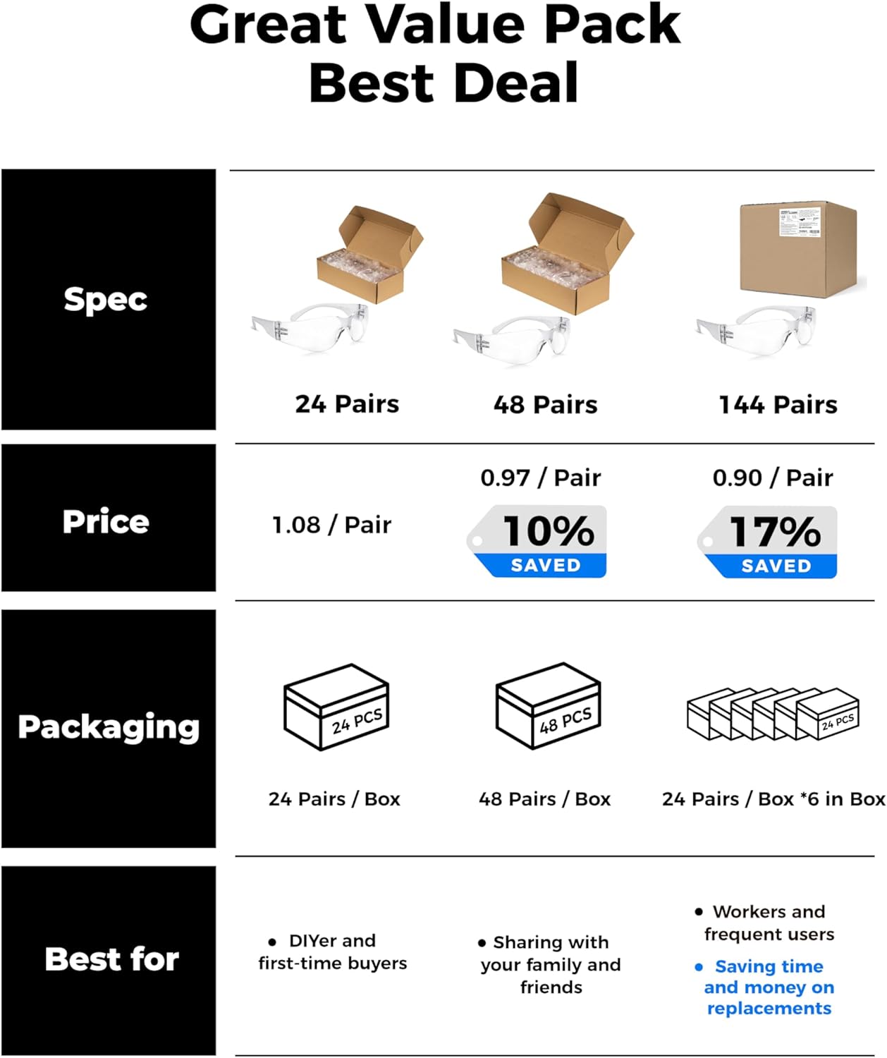 - MULTIPACK FOR DAILY USE: Bulk pack of 48 pairs of Individually-Wrapped Protective Safety Glasses. Reasonable price for your everyday protection. Let Amoolo guard your eyes against particles, splashes and debris to the naked eye
