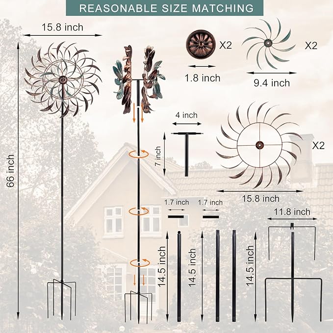 - GARDEN DECOR:Our yard art wind spinner add a touch of ambience to your patio, lawn or garden. Relaxing to watch while spending time in out on the sun porch or yard. Would look amazing in any flower garden or backyard
