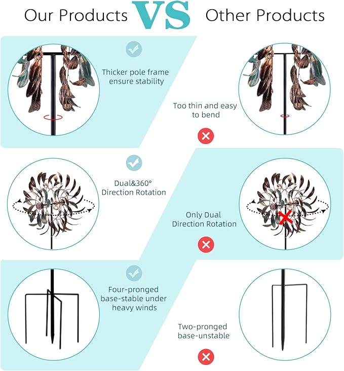 - STABLE:The metal wind spinners has a solid metallic construction with easy spinning copper blade which smoothly rotates on sealed bearings. Four-pronged at the base for extra stability