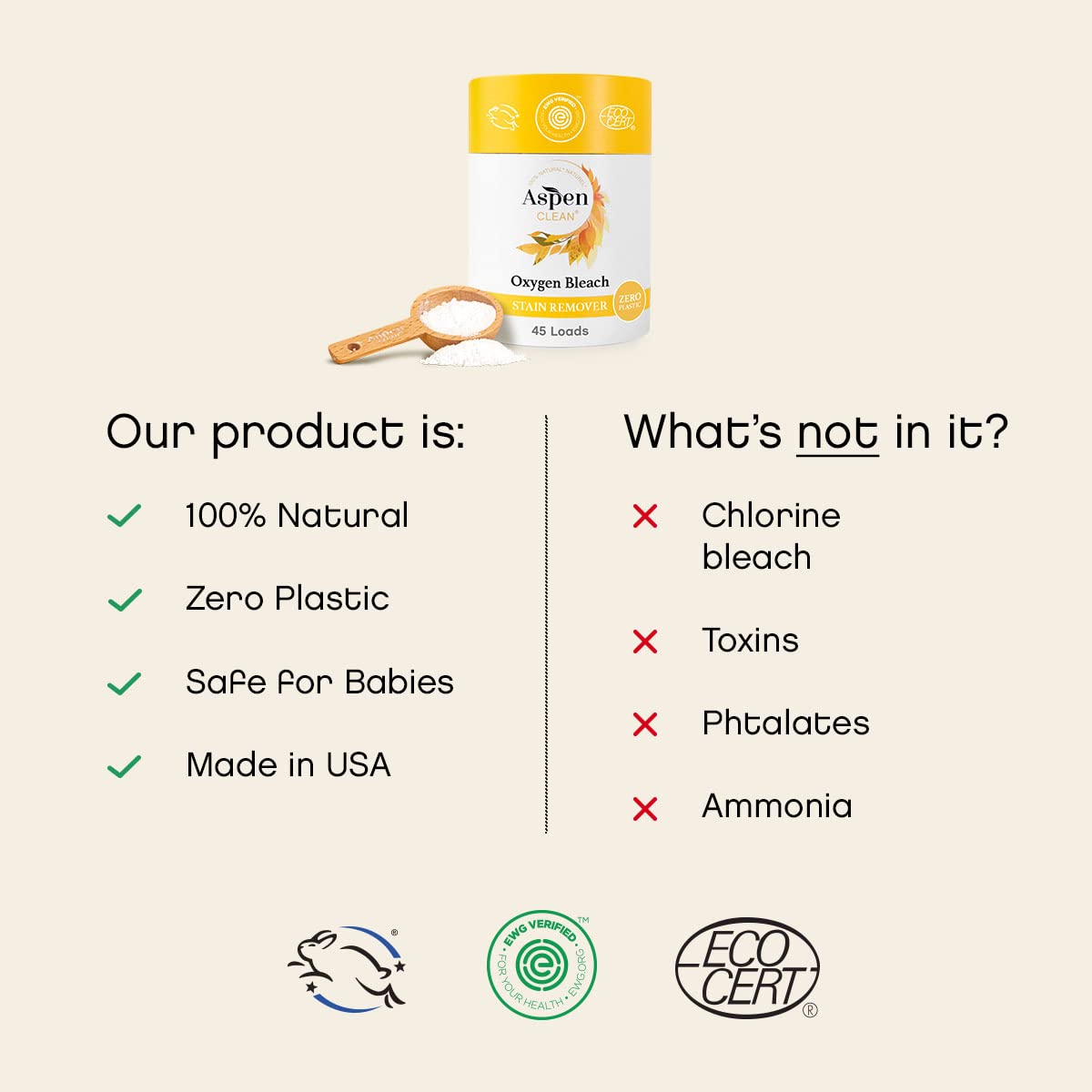 - No harsh chemicals & hypoallergenic: The Aspen Clean oxygen bleach laundry powder removes any kind of clothing stain but is still gentle on skin and doesn’t use harsh chemicals or toxins. They are certified by EcoCert.