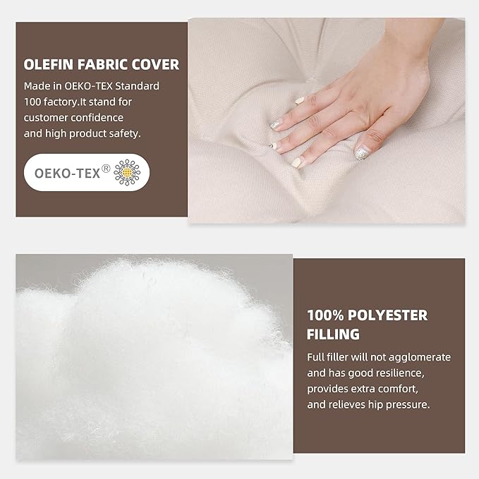 - Comfortable & Durable: RACE LEAF cushions are made of Olefin fabric cover and 100% polyester fiber filling. The cover fabric has been treated with solution-dyed to resist fading, light fastness can withstand up to 1,500 hours and still not fade. The filling is 100% polyester, will not agglomerate has good resilience, provides extra comfort, and relieves hip pressure