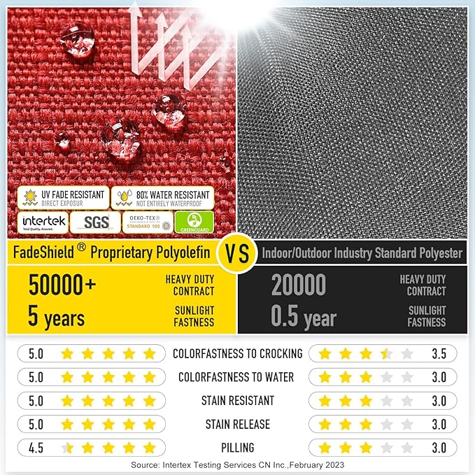 - 【FadeShield - UV Fade Resistant】FadeShield Proprietary Polyolefin are dependable indoor/outdoor performance fabrics, they are infused with antimiсrоbial silver Ion technology and can withstand 5 years of UV fade resistance, solution-dyed to make sure that each color is deeply ingrained in every fiber for continued vibrancy, even after heavy use. We recommend bringing it indoors when it rains or when not in use to preserve its lifespan and keep it looking beautiful.