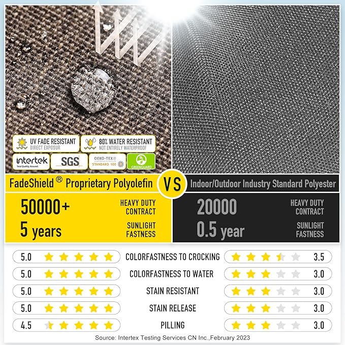 - 【FadeShield - UV Fade Resistant】FadeShield Proprietary Polyolefin are dependable indoor/outdoor performance fabrics, they are infused with antimiсrоbial silver Ion technology and can withstand 5 years of UV fade resistance, solution-dyed to make sure that each color is deeply ingrained in every fiber for continued vibrancy, even after heavy use. We recommend bringing it indoors when it rains or when not in use to preserve its lifespan and keep it looking beautiful.