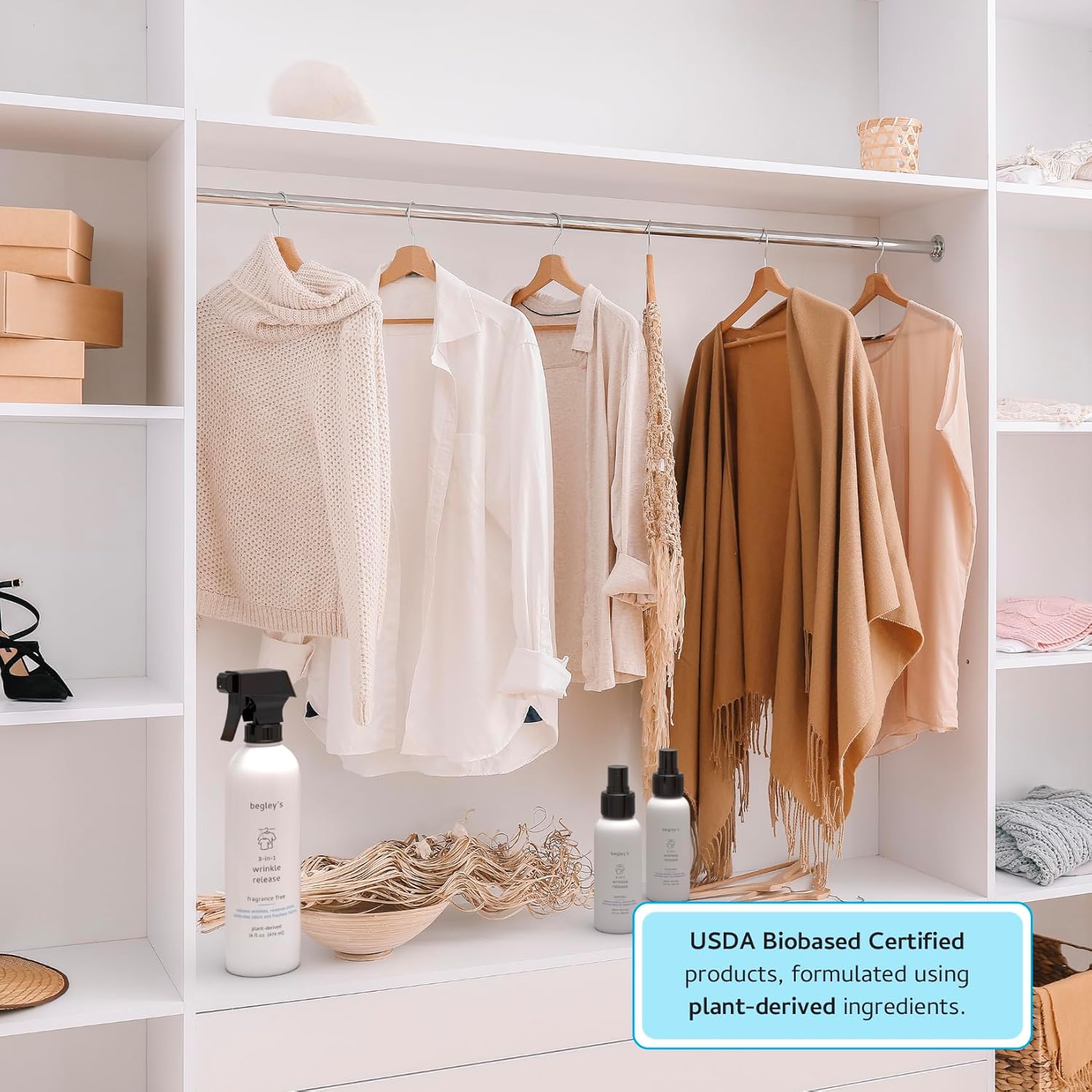 - USDA Certified Biobased - The biobased solvent is a fast and effective alternative to hand ironing. Removes wrinkles from freshly laundered clothes. Reduces static cling and puts the sleek back into wrinkled fabrics, leaving them looking good and smelling great. Indispensable for travelers living out of suitcases and students in dorms