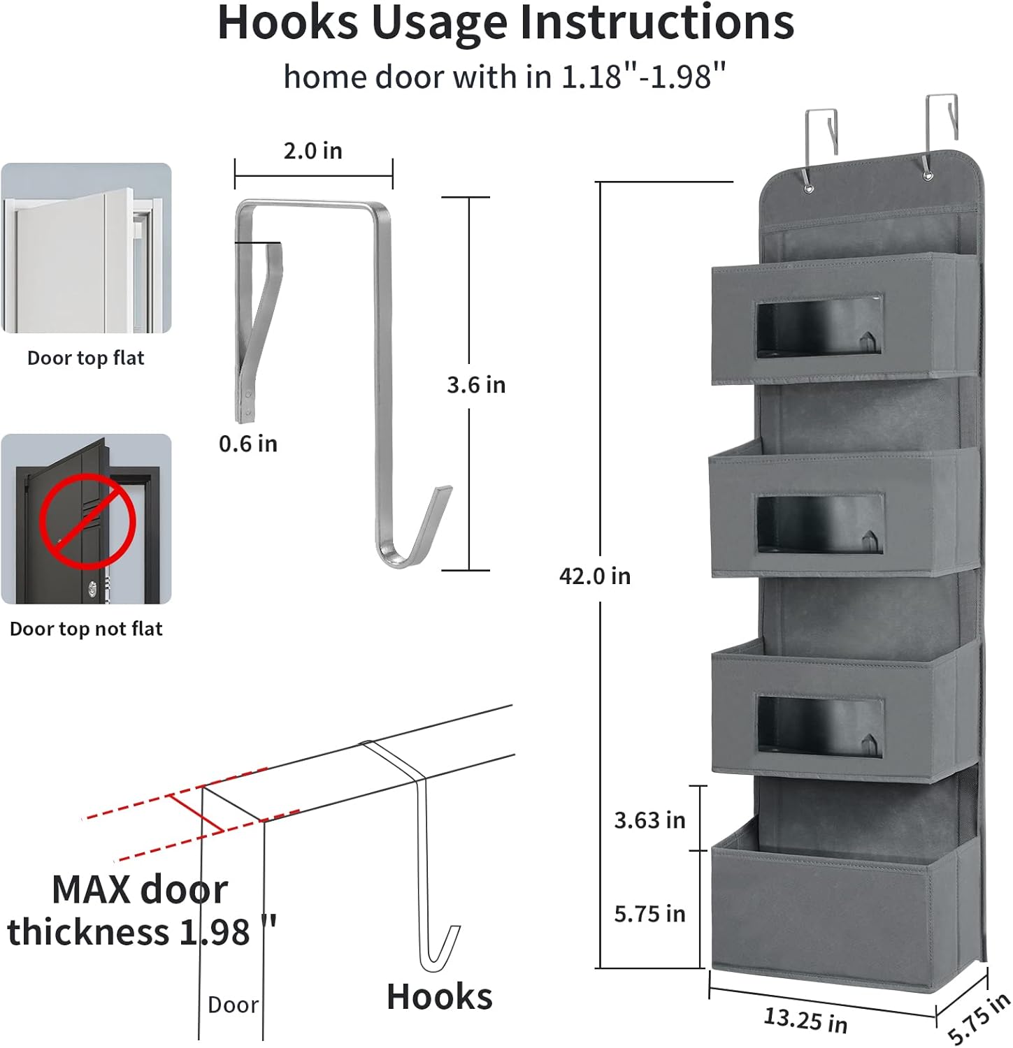 - Large Capacity Pocket Organizer Hanging:Door hanging organizers size 13.25''L Γ 5.75''W Γ 40.25"H. It has 4 large pocket organizers + 3 pvc plastic clear pocket, hanging door organizer which much wider and larger than normal door storage organizer. Tall items can be easily put in or taken out.