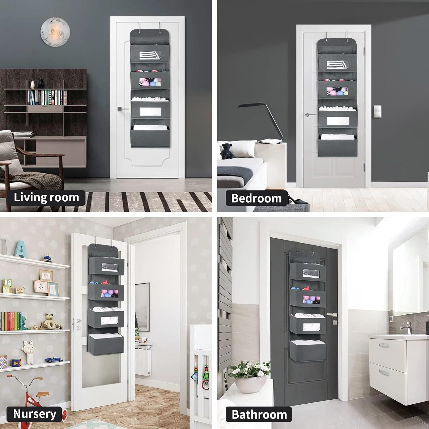 MAX Houser 4-Shelf Over The Door Hanging Organizer with 2 Metal Hooks,4 Pocket Over The Door Wall Mount Storage with Clear Windows for Baby Nursery Bathroom Closet,Bedroom,Dorm,Diapers,Kids Toys(Gray)
