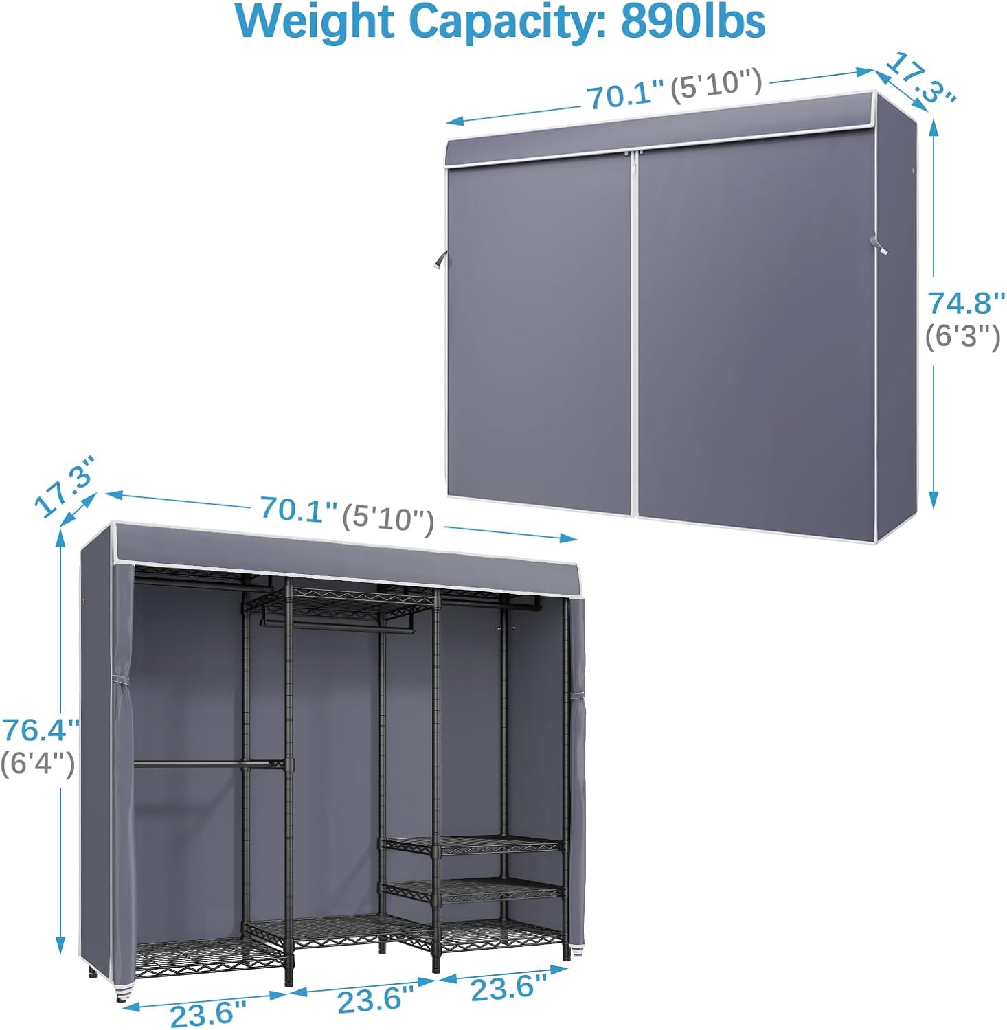 - Dimensions & Load Capacity: 70.1" L x 17.3" W x 76.4" H (includes cover). Load capacity up to 890 lbs. Single hanging rod can support up to 60 lbs, Wire shelf can support up to 88 lbs for each.