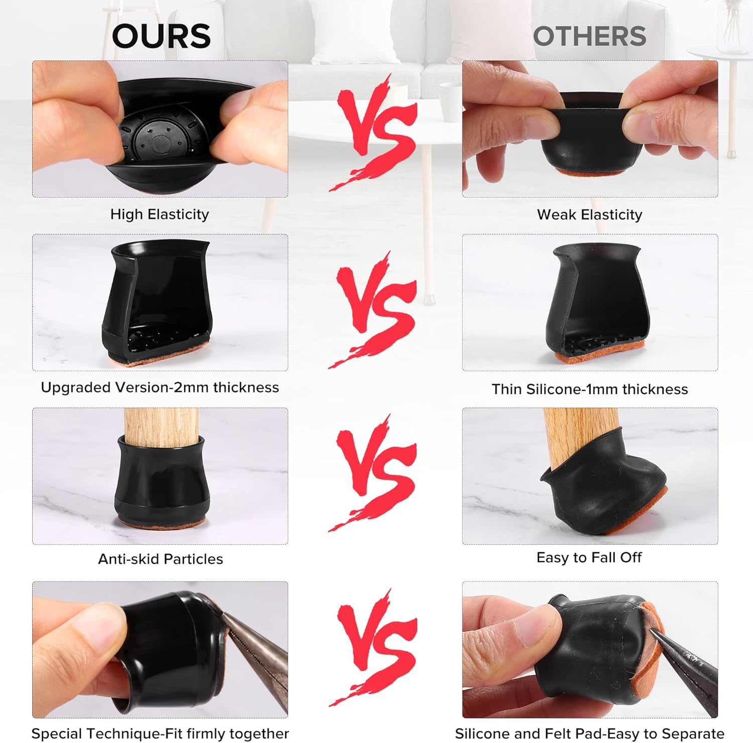 - ✅【Latest Upgrade】Compared with most of the traditional 1mm furniture pads on the market, our silicone chair leg protectors are made of 2mm thick silicone, which will never be damaged, durable. The ruby for chair legs will not change color when stretched. Inside of the inner sleeves are particles with anti-slip, which will firmly fix the chair and never make the covers fall off. Felt pads at the bottom make your furniture move silently and smoothly along floors without leaving marks and noise.