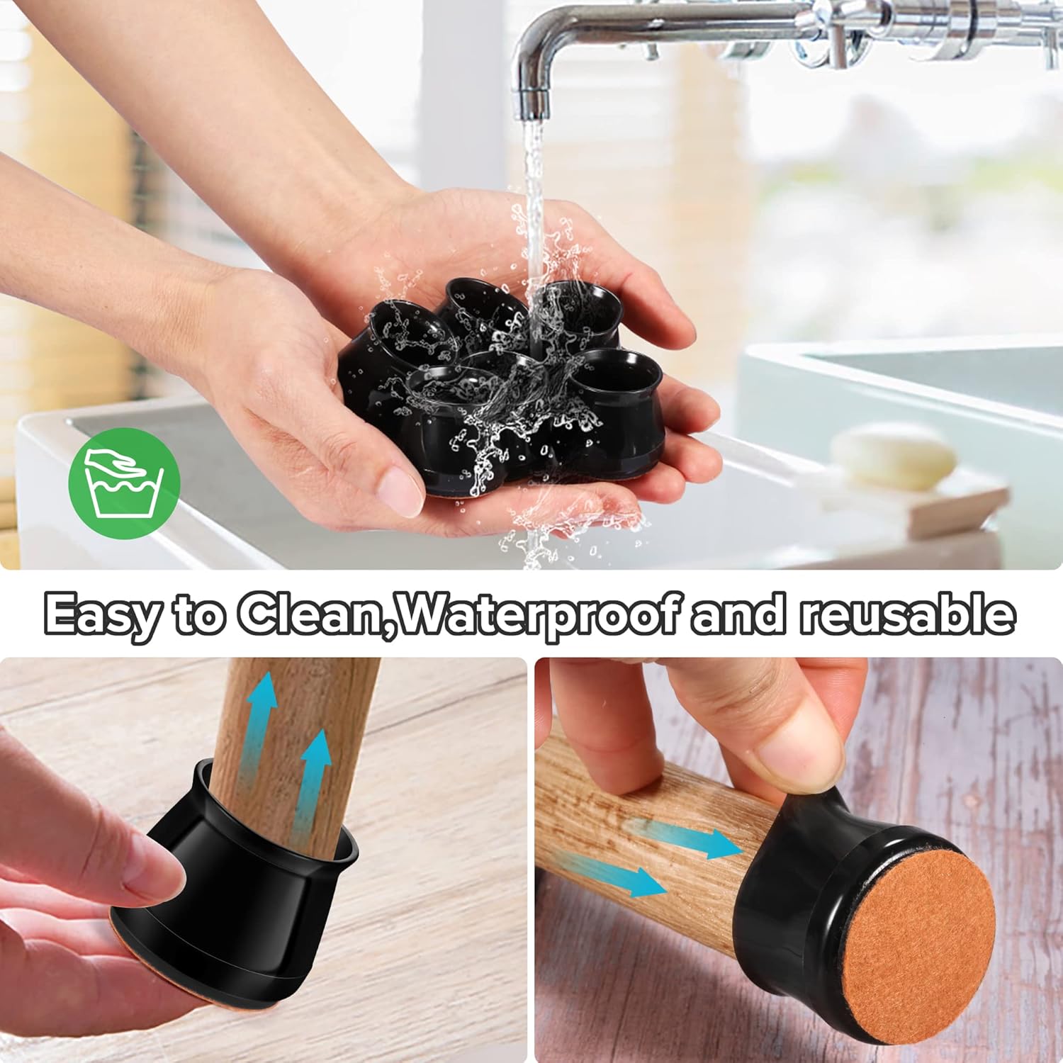- ✅【Easy to Use】The chair leg covers to protect floors has high transparency, which greatly restore the original color of the table and chair legs, look more natural. The furniture leg cap is easy to install, without the use of tools. When the furniture chair socks are dirty, the chair stoppers can be cleaned and used repeatedly. Mainly suitable for smooth floors such as hardwood, tile, composite floor, and vinyl floor. Clear cap style match with most floors.