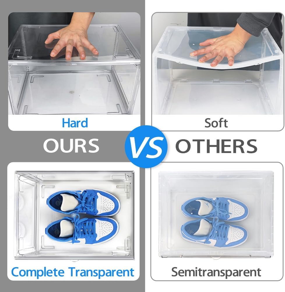- 【Fit Your High-Tops】: Each shoe crate measures 14.1" L x 10.6" W x 8.9" H, providing ample space for up to size 15 women's shoes or size 14 men's shoes. The sturdy construction, made of thick high-hardness PET acrylic panels, ensures that your high-tops, sneakers, and boots are securely stored.