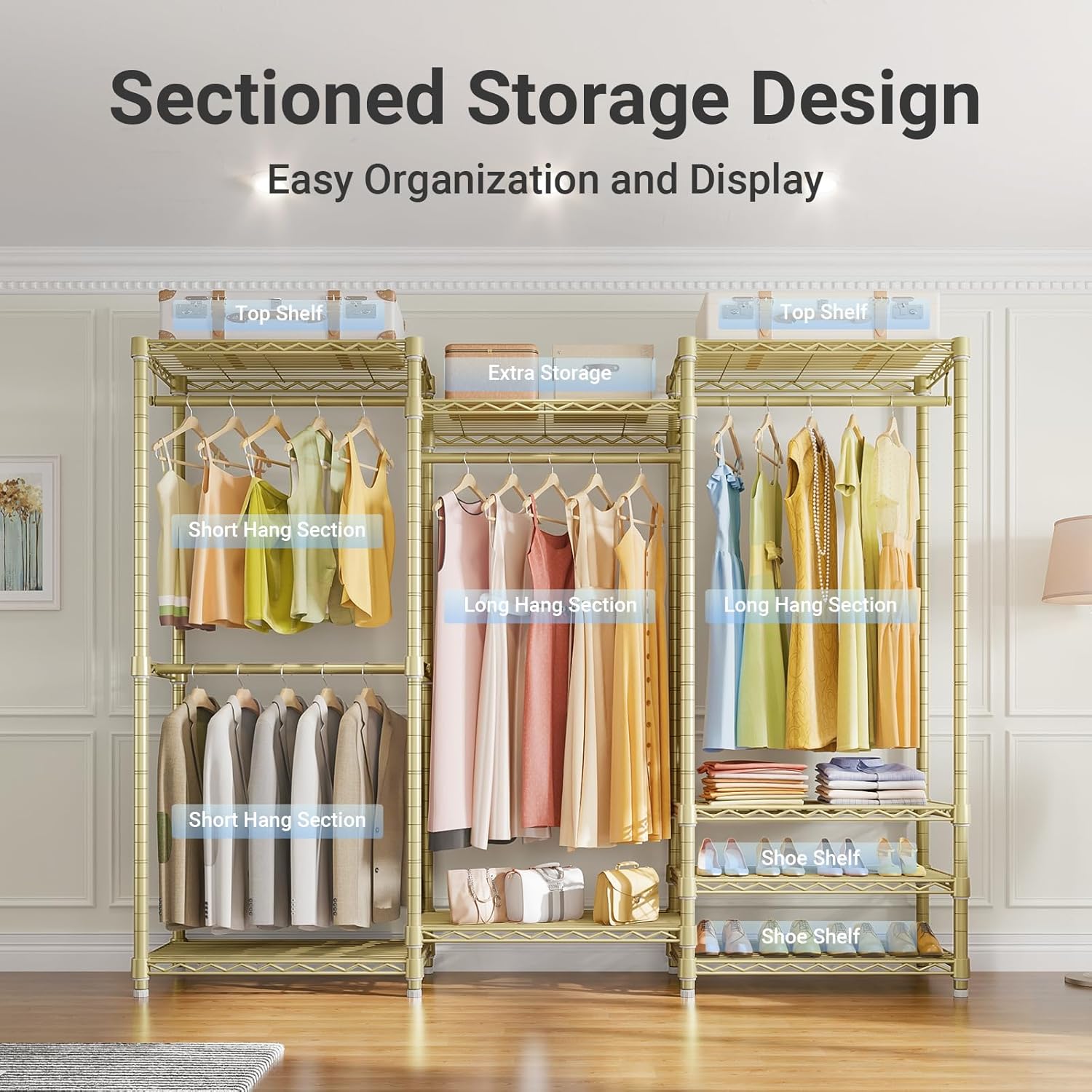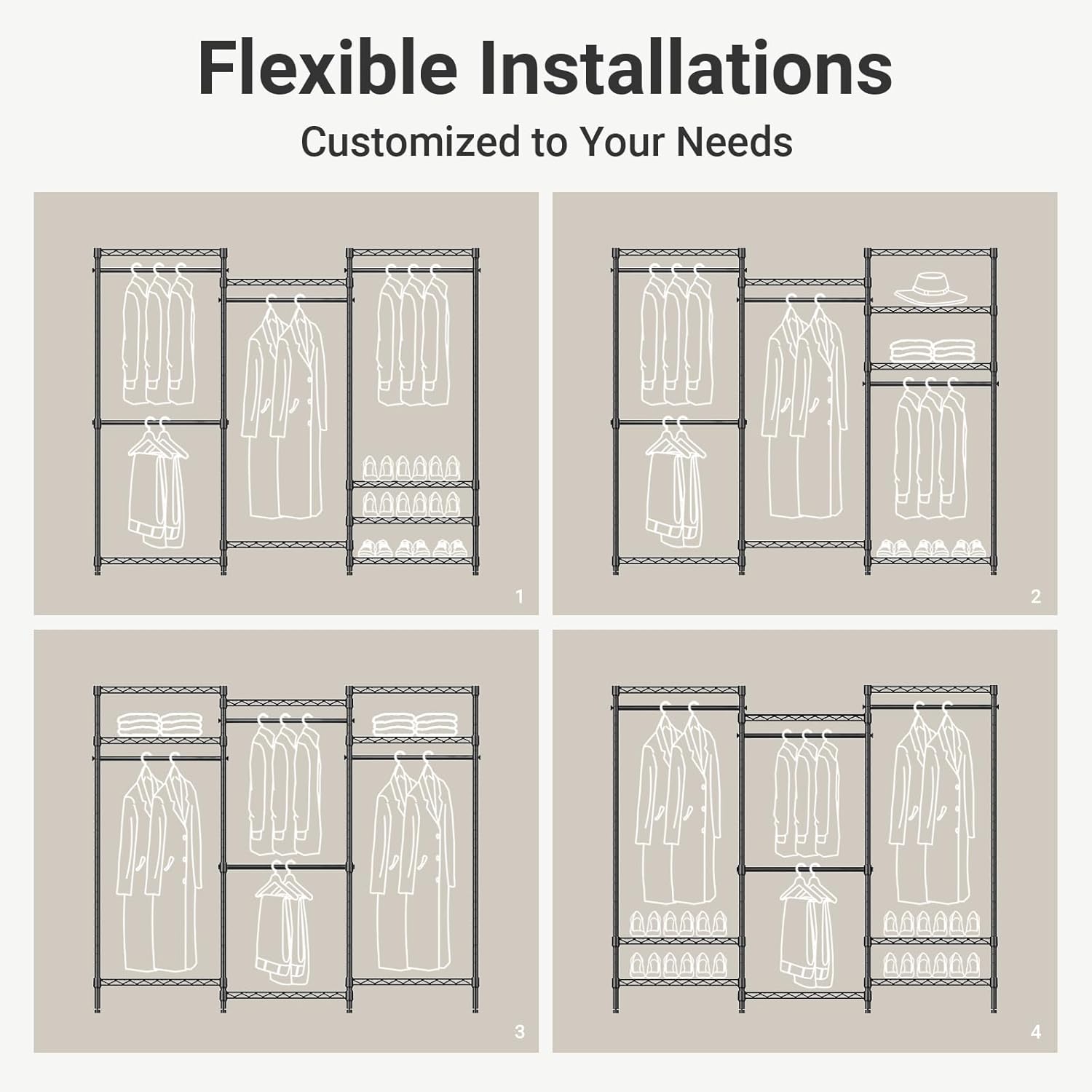 - Multifunction Closet Rack: 6 Tiers Closet Rack maximize the storage area, ensure you enough space to place your clothes, accessories, bedding, lining, shoes, etc. The 4 pcs clothes hanging rods hold up to 60 lbs for each, it is great for hanging suits, coats, long dresses, jackets, pants, shirts or other heavy clothes.