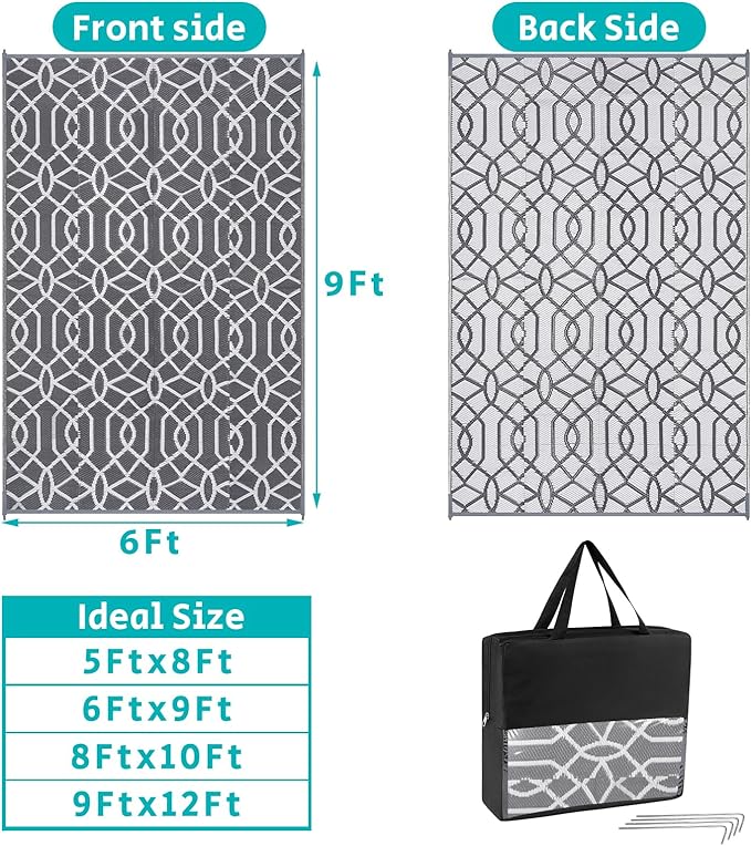 - Versatile Outdoor Carpet: The indoor outdoor plastic rugs have multiple choice in different colors(4'x6',5'x8',6'x9',8'x10',9'x12',9'x18',8'round), is ideal for a variety of indoor outdoor activities,like patio mat, deck rug, garden rug, beach mat, picnic mat, BBQ party mat, rv camping rug,pool rug,outdoor doormat,garage rug,front door mat,allowing you to have plenty of imaginable space for more fun.