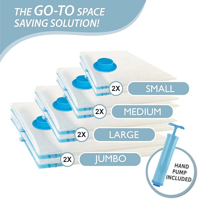 8 Pack Vacuum Storage Bags, Space Saver Bags (2 Jumbo/2 Large/2 Medium/2 Small) Compression Storage Bags for Comforters and Blankets, Vacuum Sealer Bags for Clothes Storage, Hand Pump Included