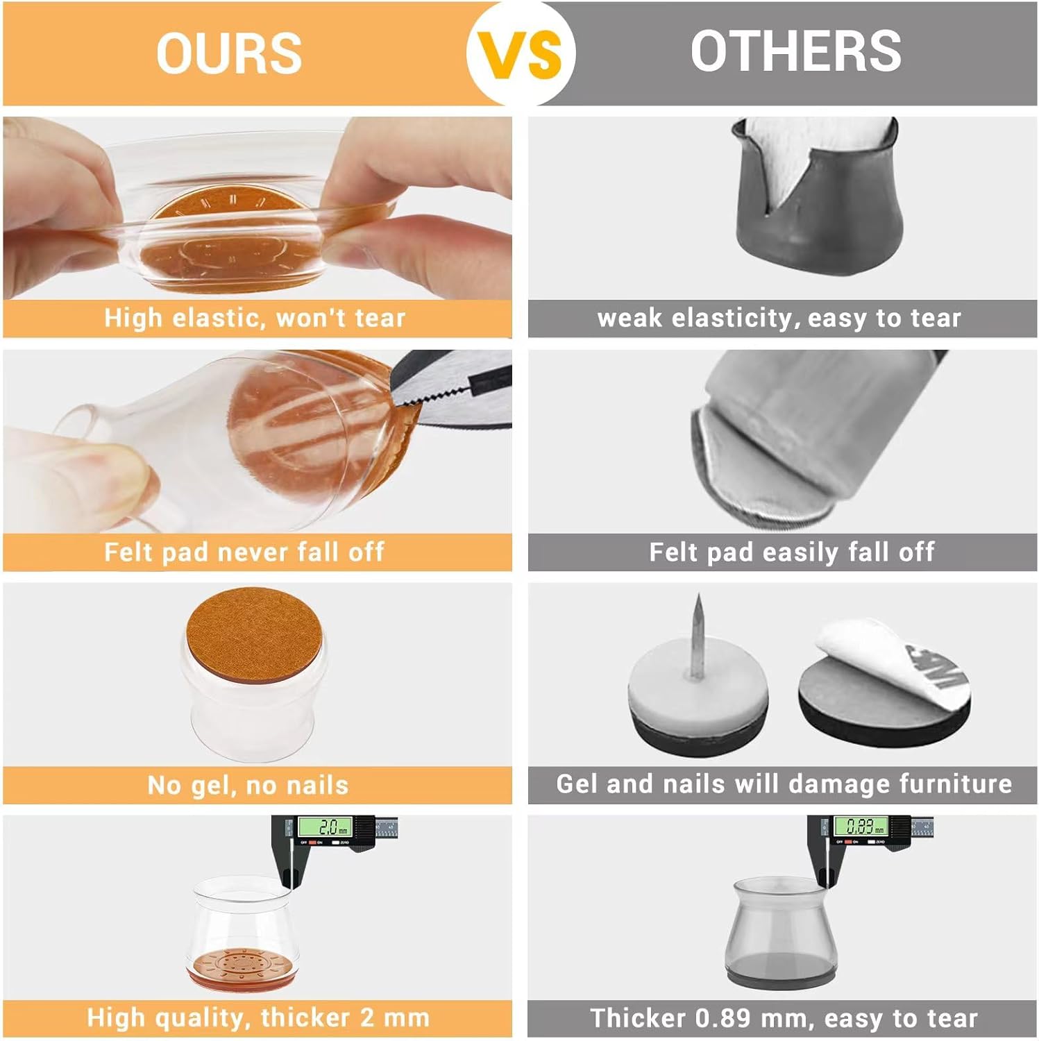 - 【The Felt Pad Never Fall Off】: Latest upgrade! Our chair leg protectors for hardwood floors do not use gel. The bottom felt pad and the silicone chair leg floor protectors are integrated with a high-pressure machine to ensure that they will never fall off. Ordinary felt furniture pads use gel, which is not strong enough, the felt pads are easily sliding off and stain your floor.