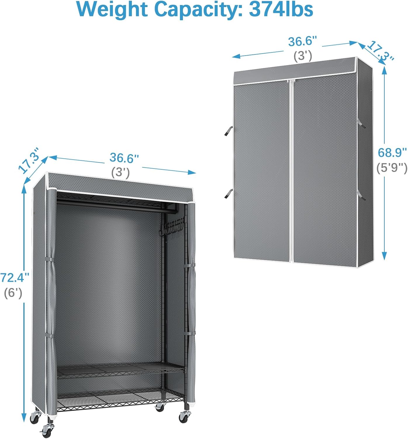 - 【Zippered Polyester Fabric Cover】Closet comes with upgraded polyester fabric cover, sturdy, wrinkle resistance, breathability keep garments dry. Easy to clean with damp cloth, and to keep your item away from dust.