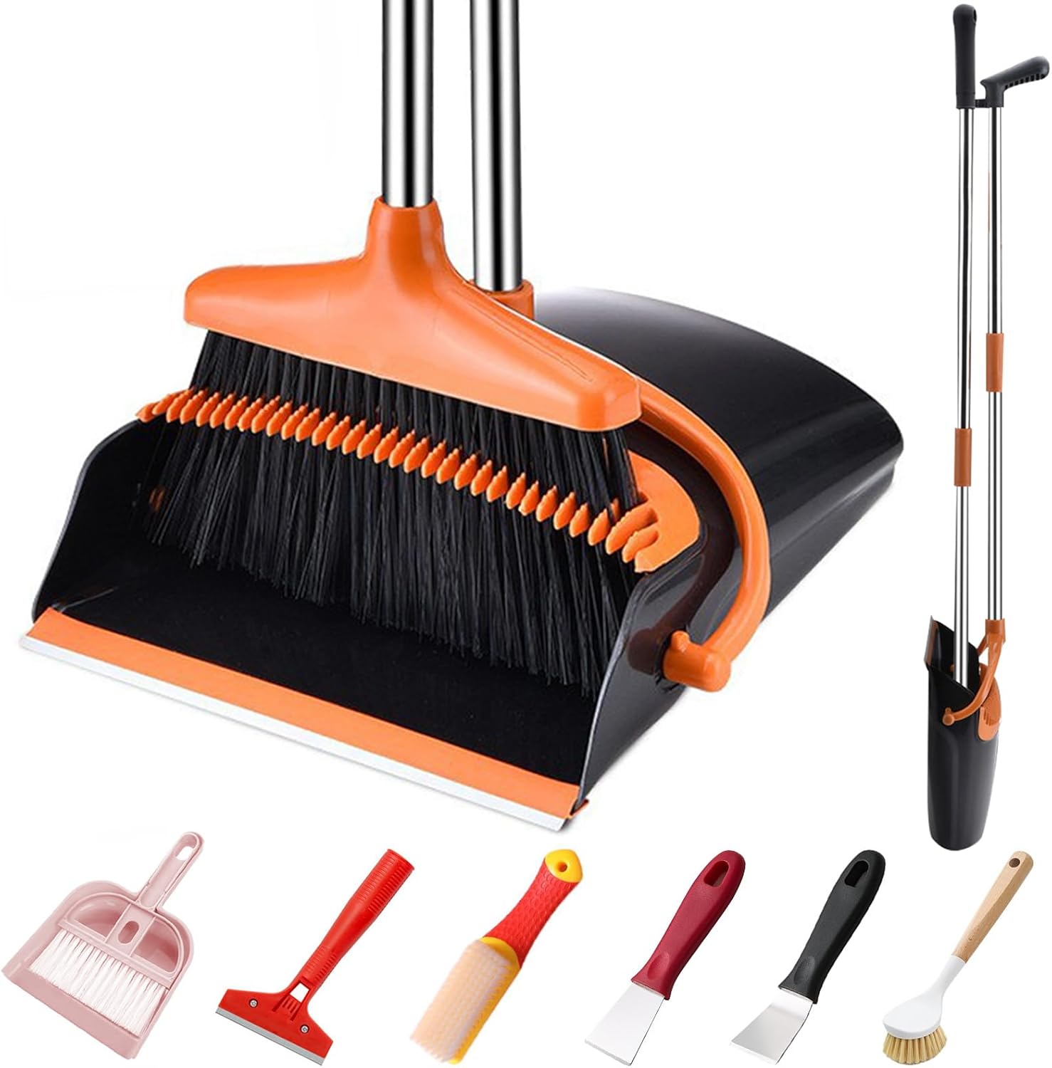 Broom and Dustpan Set with Long Handle and 6 Bonus Cleaning Tools, Upright Standing Combo with Self-Cleaning Teeth & Windproof Dustpan for Pet Hair, Home, Kitchen, Garage, Apartment