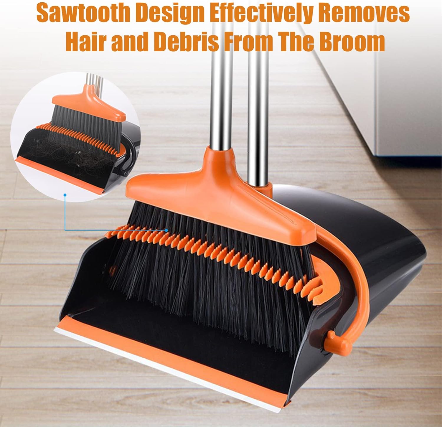 - ⭐【Self-Cleaning Teeth – Hands-Free Hair Removal】Built-in comb teeth on the dustpan edge quickly strip pet hair, long human hair, and dust from broom bristles—keeping your hands clean and making sweeping effortless.