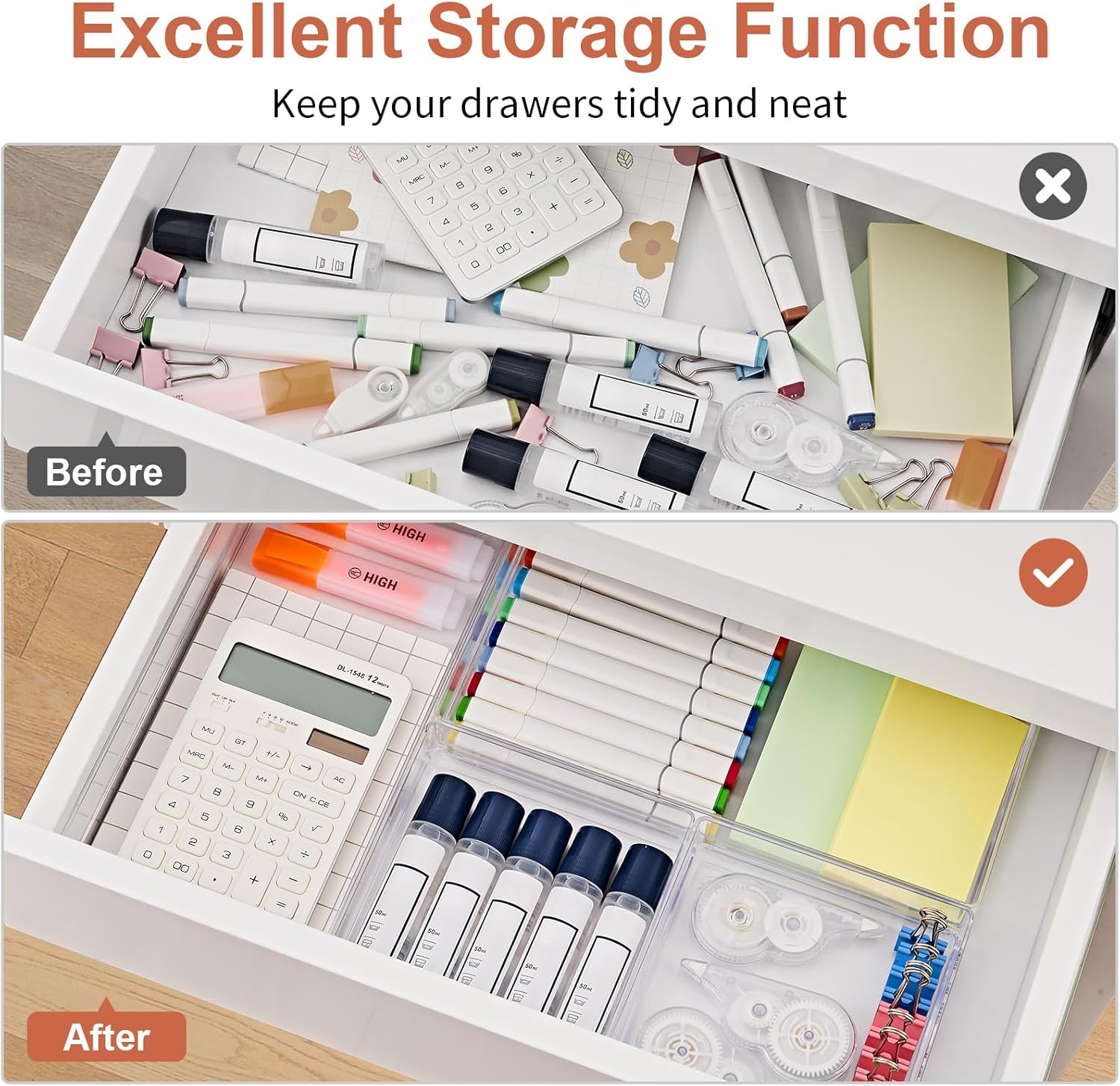 - Space Saving and Stackable Trays: Stackable drawer organizers can be stacked and sorted out in your space easily. Clear drawer organizers can save you time to organize and find your stuff, itโs easy to find and use your items in the drawer, keep your space neat, and help you get a neat lifestyle and enjoy more.