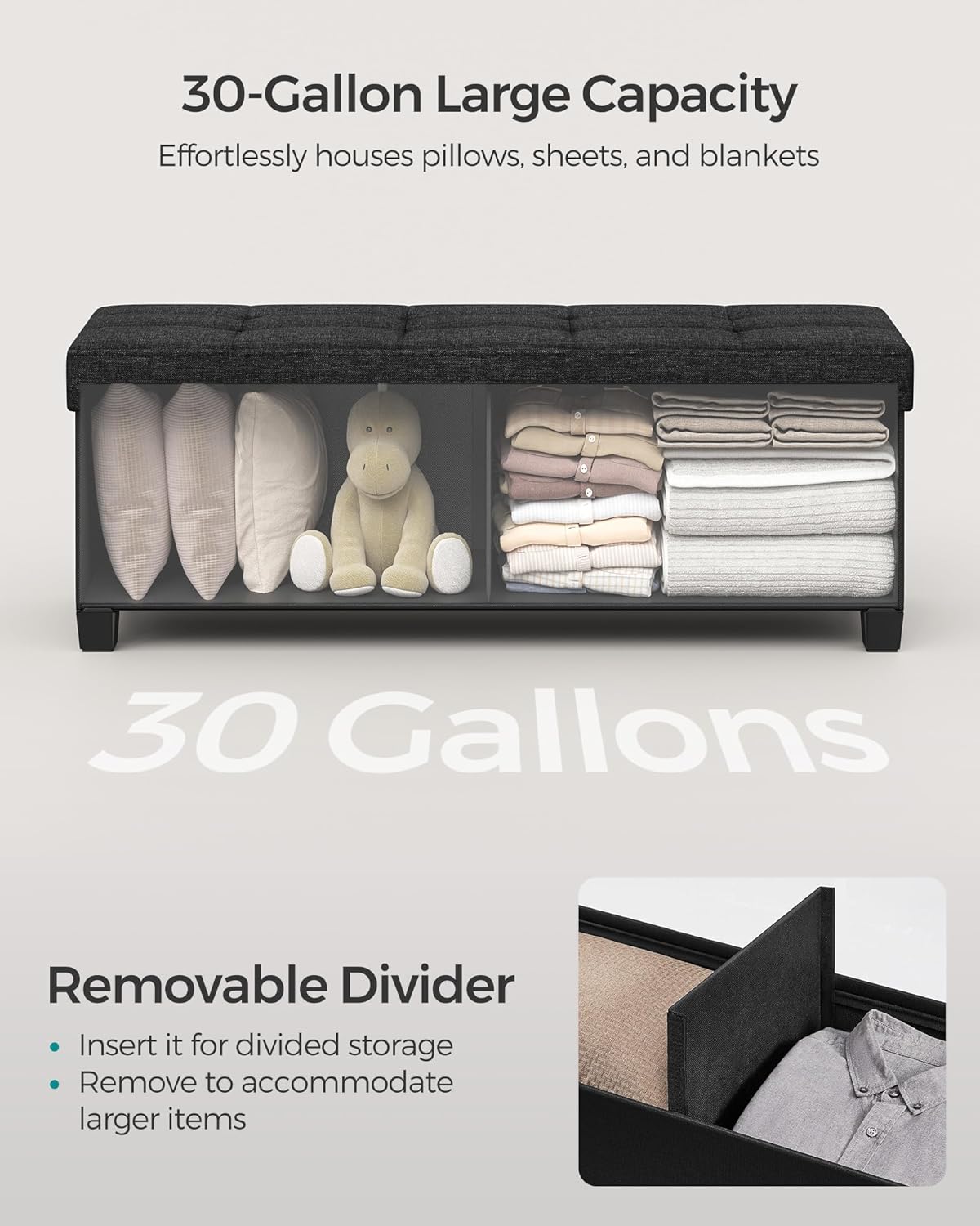 - ăSPACIOUS STORAGEăSized at 15"D x 43"W x 15.7"H (38 x 110 x 40 cm), this end of bed bench offers a 30-gallon (112 L) volume for your blankets, books, and bed sheets. A removable divider is included to keep you items neatly sorted