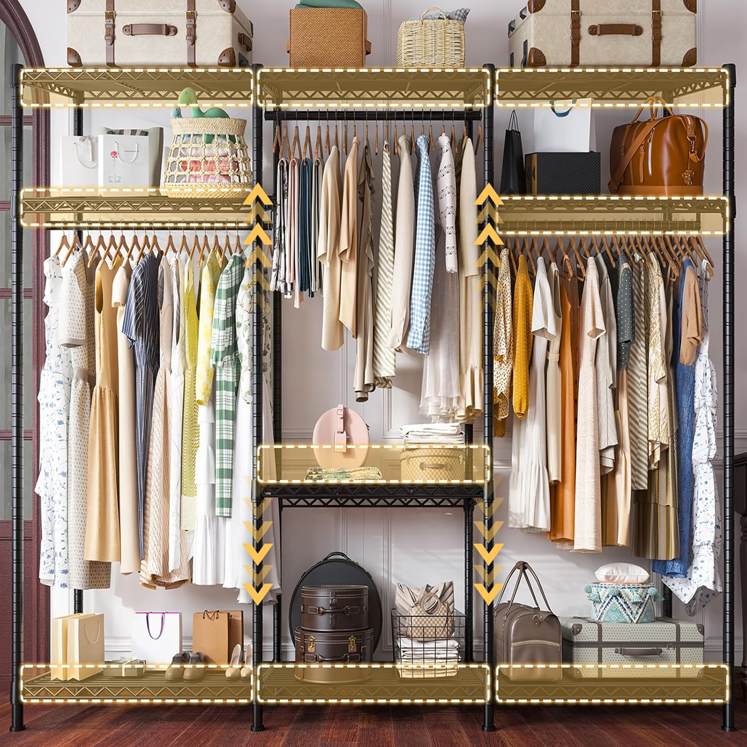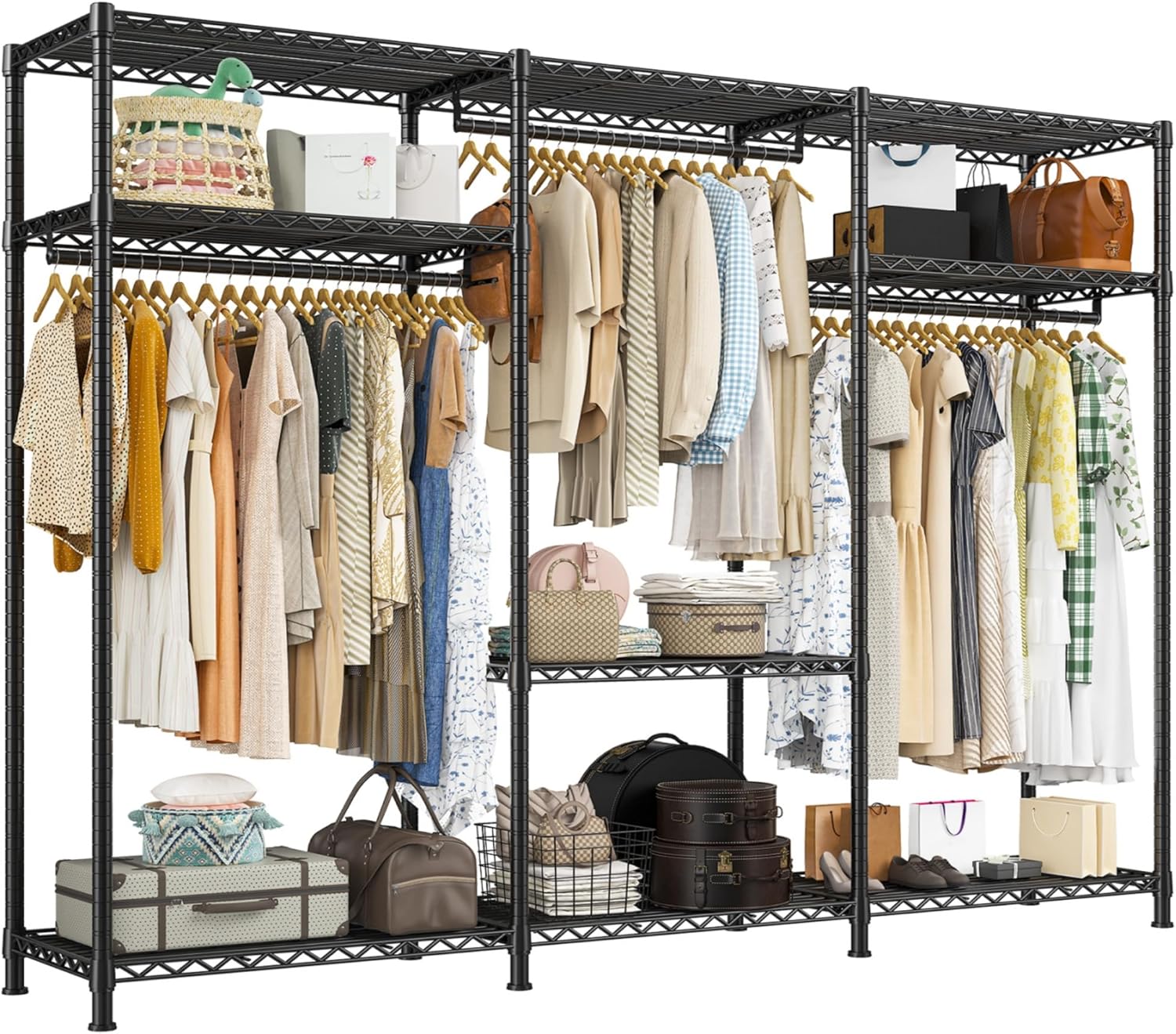 - 【9 Adjustable Shelves & 3 Detachable Hangers】The garment rack for hanging clothes are all easily adjustable and detachable by the slip-sleeve locking system, all you need to do is assemble the clips higher or lower. 9 shelves can put luggage, quilt, storage box or shoes, etc. 3 Metal hangers can hang long dress or coats saving and keeps room clean and tidy. A perfect DIY portable clothes rack meets all needs.
