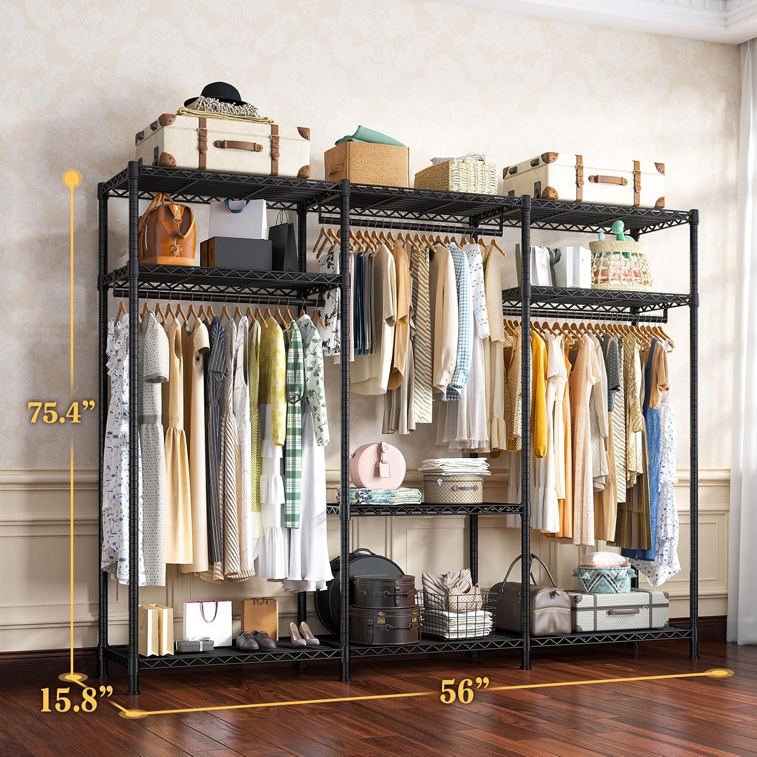 - 【Heavy Duty Clothes Rack with Large Storage Space】Dimention:56"W X16"D X 75.5"H. Raybee heavy duty clothes rack suits different place: bedroom, cloakroom, clothing store, laundry room, corners. Easily put 160+ clothes and other things on clothing rack, which is best space-saving helper.