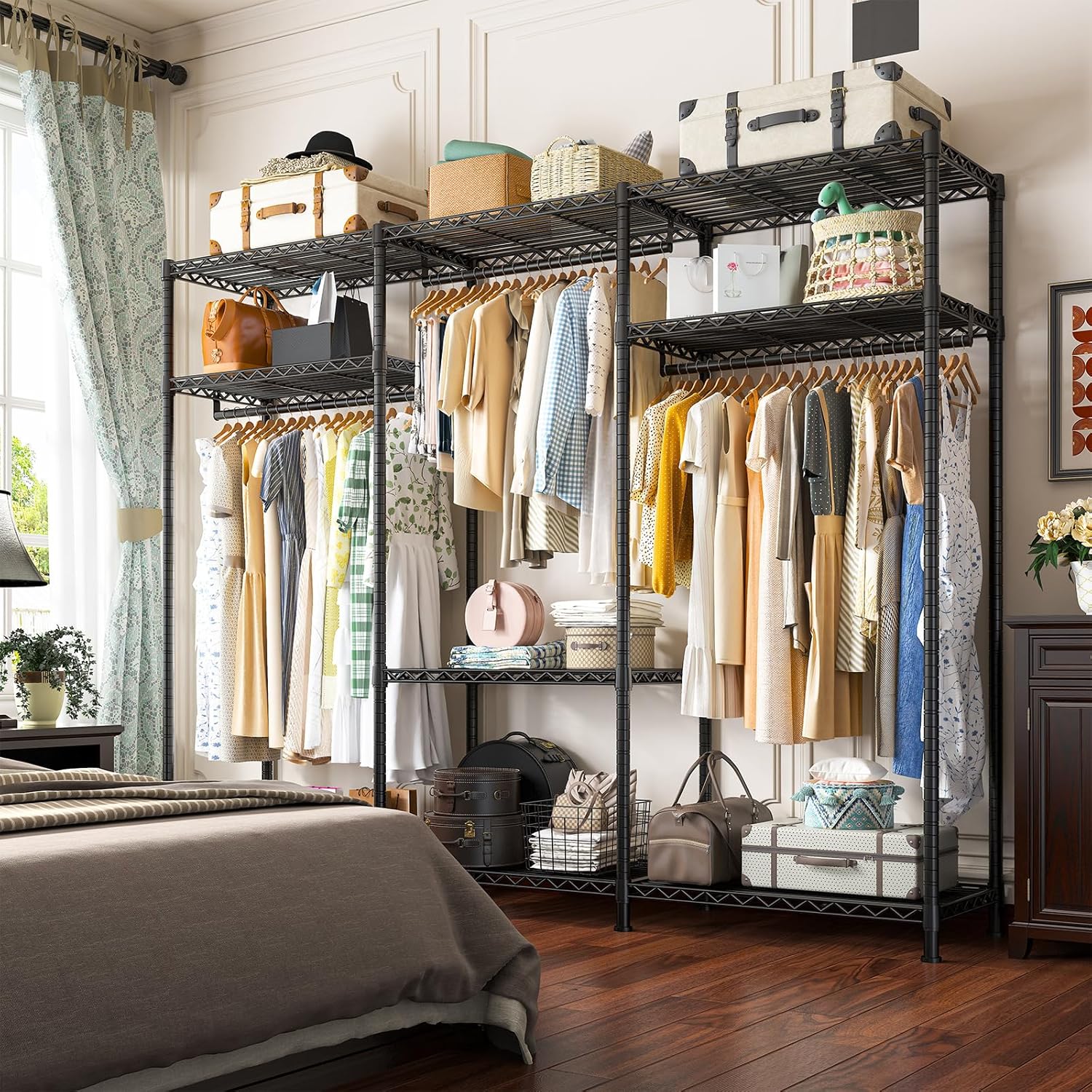 - 【Hanging Long skirts wrinkle free】Raybee heavy duty clothes rack adopts a specially heightened design. Two 75.4 " long clothes hanging area helps to hang long skirts, coats and keeps wrinkle free, and 9 shelves can provide you with a spacious space to store clothes and other private necessities.