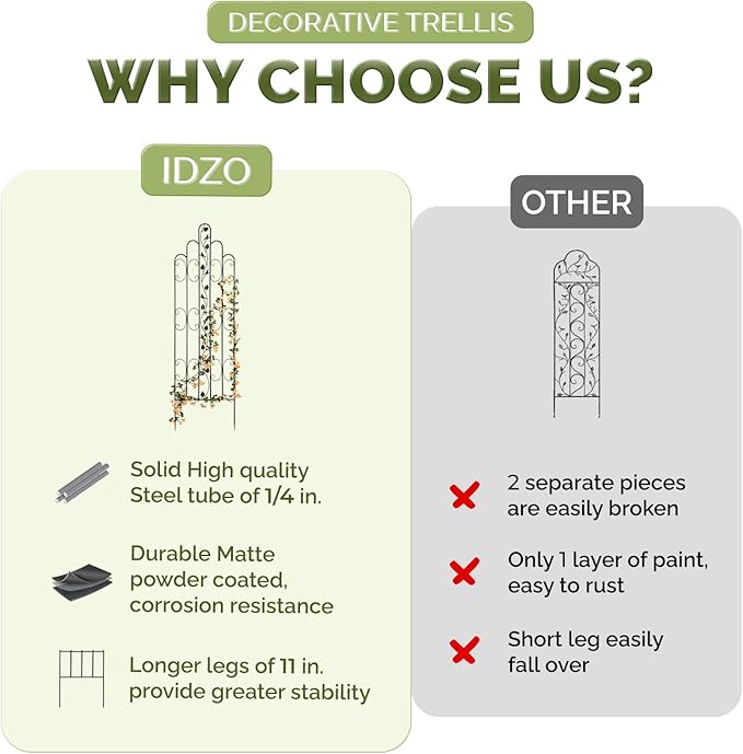 - π BUILT FOR LONG LASTING BEAUTY: The high quality steel trellis for climbing plants with outstanding strength and durability provides solid support for climbing plants; Its powder coating protects it from rust and corrosion, ideal for outdoor use