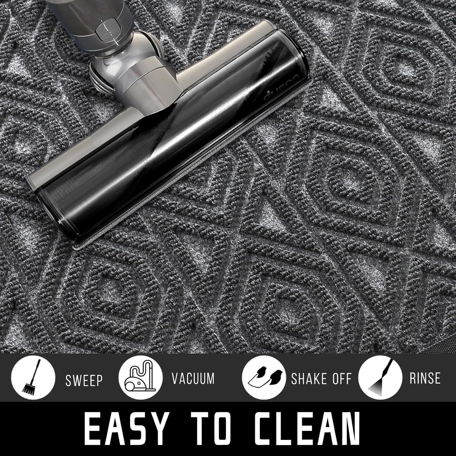 - [CAPTURE DIRT AND MOISTURE] Yimobra front door entryway mat outdoor with unique pattern design, forming a detention dam extending in all directions, helping to capture dirt, dust, gravel, mud, sand, grass or other messy debris and prevent them from entering Indoor; The surface of floor mat beautifully woven polyester fabric absorbs moisture, and the sturdy oblique rubber edge will not accumulate water in rainy and snowy days, keeping your home dry and clean